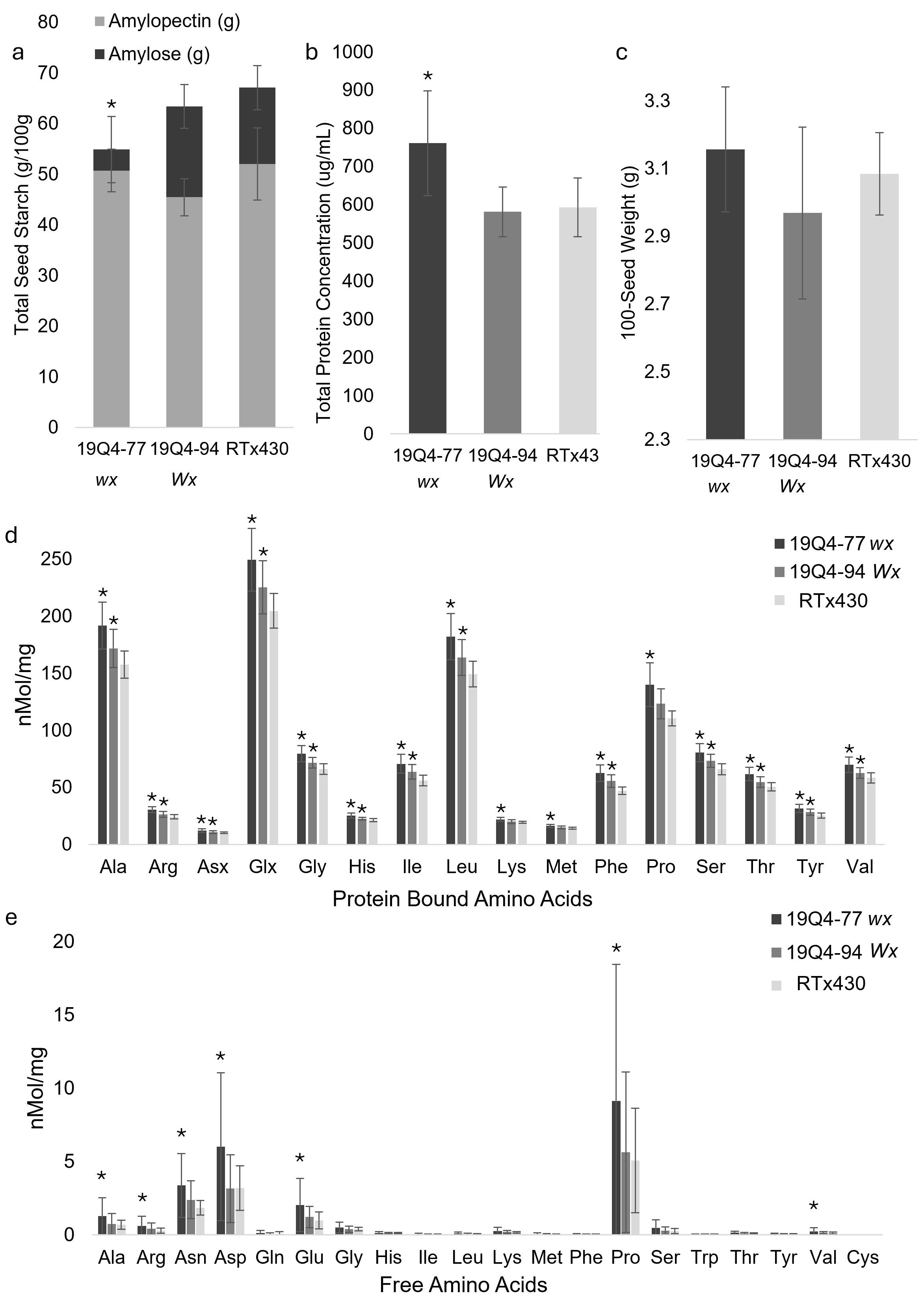 Figure 5. Starch content (g/100 g) and corresponding amylose/amylopectin content (A), protein concentration (µg/mL) (B), nanomolar concentration of protein-bound (D) and free (E) amino acids per milligram, and 100-seed weight g (C) of 19Q4–77 wx, 19Q4–94 Wx, and RTx430 [wild type (WT)] seeds. Error bars (n = 6 for total starch content, n = 10 for 100-seed weight, and n = 27 for protein concentration, free amino acids, and protein-bound amino acids) represent standard deviation. Bars with asterisks denote significant differences between that sorghum line and unedited RTx430. The asterisk for 19Q4–77 wx denotes significant differences between said line and unedited RTx430’s total starch content as well as amylose/amylopectin ratio (Student’s t-test, α = 0.05).