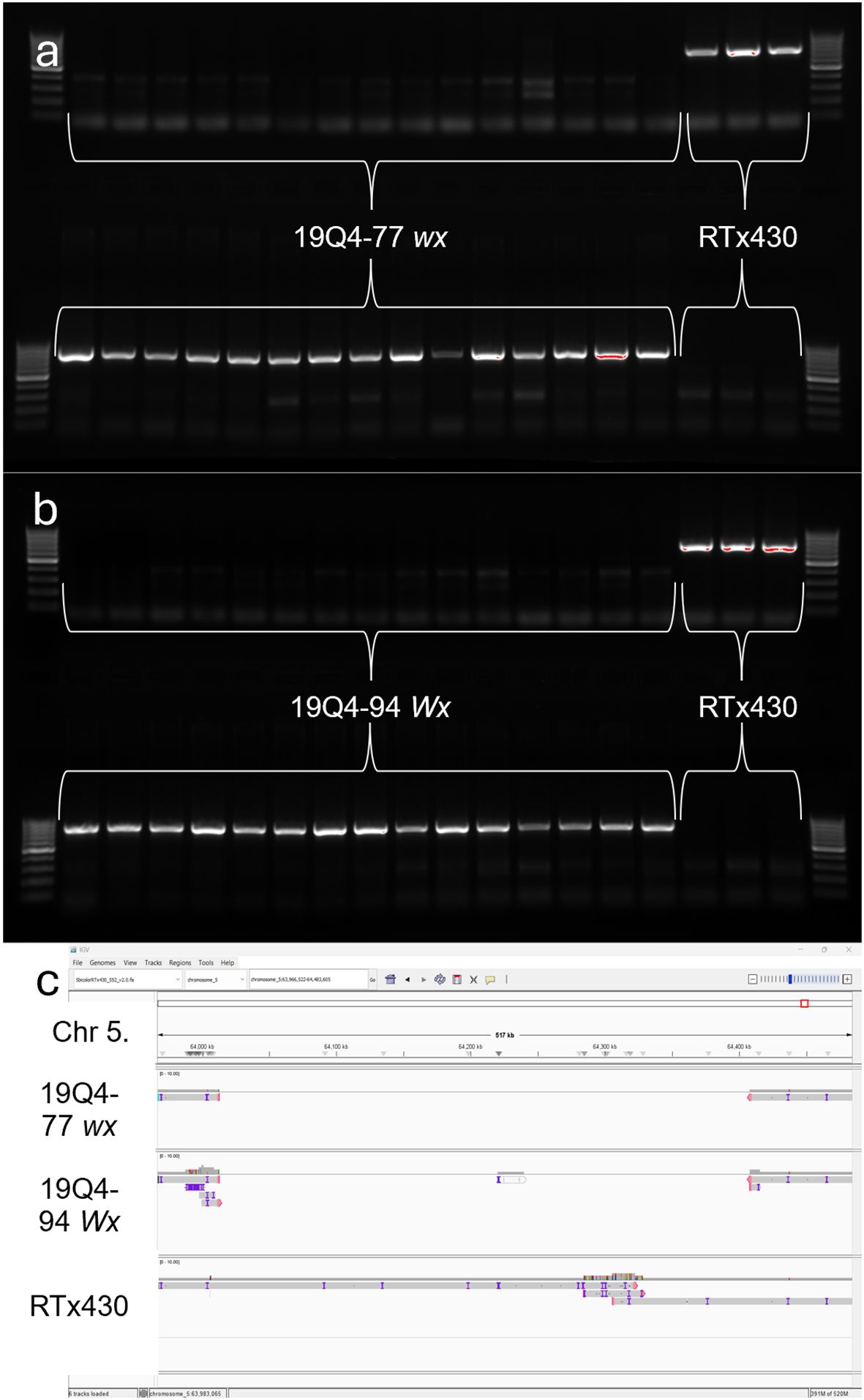 Junction fragment amplification and sequencing were used to characterize the presence or absence of the CRISPR deletion in 19Q4–77 wx and 19Q4–94 Wx. The amplification of the homozygous, deletion-free, wild-type genome can be observed in the wild-type (WT) labeled lanes with resolution at 716 bp and a lack of amplicon banding at 780 bp (Figures 6a, b). The presence of the deletion is denoted by an amplicon resolving at 780 bp using deletion-present designed primers. The lack of a band resolving at 716 bp for these plants indicates the lack of heterozygosity at the deletion site and, thus, a homozygous status for the deletion in these plants. These results support the proposed existence of a 400-kb deletion in 19Q4–77 wx and 19Q4–94 Wx in the k1C family as initially characterized by short-read sequencing.