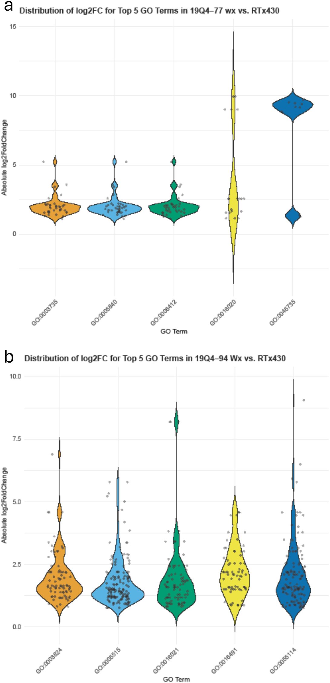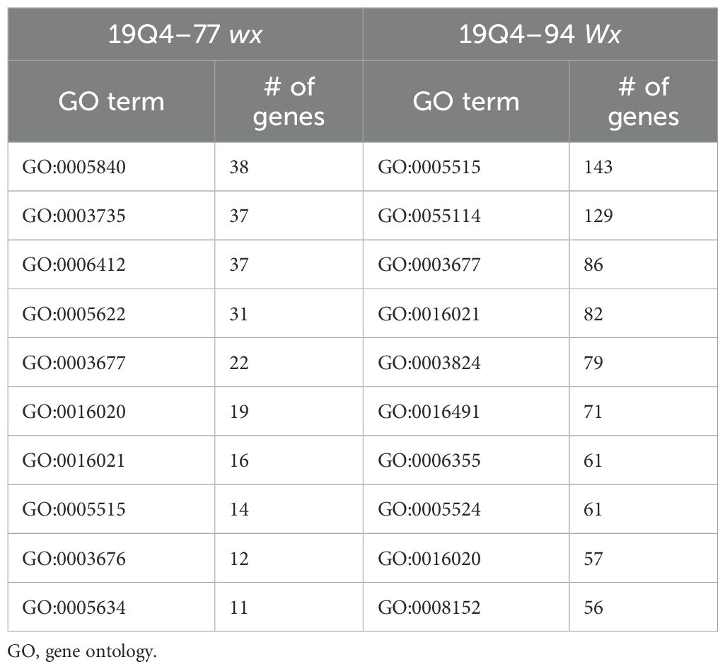 Table 1. Table of the top 10 most abundant GO terms by presence of differentially expressed genes for 19Q4–77 wx and 19Q4–94 Wx.