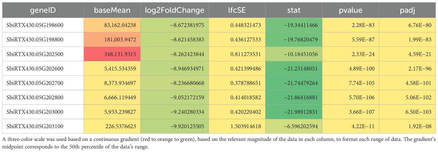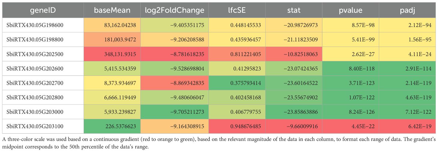 Five seeds harvested 20 days after pollination were frozen in liquid nitrogen and pulverized for crude RNA extraction and purification for each line. The Plant RNA Protocol I procedure from the E.Z.N.A™ Plant RNA Mini Kit was followed in accordance with the manufacturer’s guidelines. Two biological replicates’ purified RNA per line was subjected to cDNA synthesis and barcoded amplification using the Iso-Seq Express 2.0 kit (PacBio®). Barcoded products were then multiplexed and arrayed using the Kinnex Full-Length RNA kit (PacBio®) and sequenced using the Revio in Kinnex Full-Length RNA mode. Reads were then demultiplexed, and adapters were trimmed. After Iso-Seq pre-processing, transcriptome alignment and quantification were performed using the Phytozome S. bicolor RTx430 v2.1 reference with Salmon (Sorghum bicolor RTx430 v2.1, DOE-JGI). Differential gene expression was then performed using DESeq2 with a false discovery rate cutoff of 0.05. Differentially expressed genes (DEGs) can be found in Supplementary 1. DEG sequences were then obtained by extracting associated FASTA sequences from the reference genome and exon GFF3 files. These extracted sequences then underwent BLAST analysis with 100% alignment length parameters against the annotated k1C sequences of S. bicolor BTx642 v1.1, DOE-JGI (Sorghum bicolor BTx642 v1.1, DOE-JGI), produced by the US Department of Energy Joint Genome Institute to identify RTx430 k1C sequences. Figure 2 denotes the loci of each k1C member identified using BLAST of the extracted k1C sequences. The top 10 most abundant gene ontology (GO) terms by the presence of differentially expressed genes of 19Q4–77 wx and 19Q4–94 Wx can be viewed in Table 1. Differential k1C expression for the two edited lines is listed in Tables 2A and Tables 2B in heatmap format. Conditional formatting in Microsoft Excel was used to format each column’s range of values with a green to orange to red color gradient. The gradient’s midpoint corresponds with the 50th percentile value of each range, with either end of the gradient based on the maximum (red) and minimum (green) values and scaled based on the relative magnitude of each range of data.