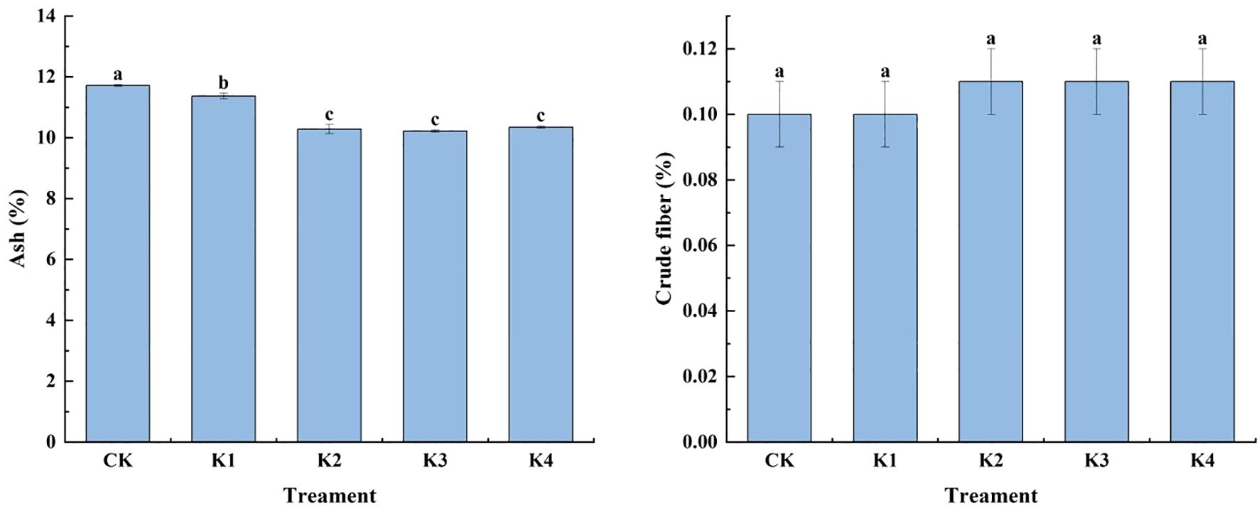 Figure 1. Effects of different potassium applications on ash and crude fiber content of Q. tumidinoda shoots. Different lowercase letters indicate significant differences between different treatments. (N = 3, P<0.05).