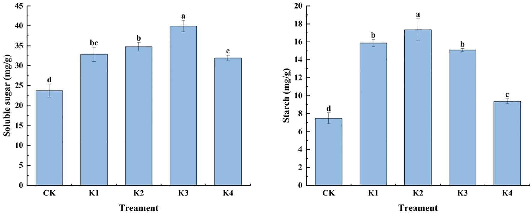 Figure 3. Effects of different potassium applications on the soluble sugar and starch content of Q. tumidinoda shoots. Different lowercase letters indicate significant differences between different treatments. (N = 3, P<0.05).