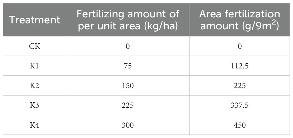 Potassium is an essential nutrient element for plants, and it is called the three elements of fertilizer together with nitrogen and phosphorus. The application of potassium fertilizer can increase and stabilize crop yield (Li et al., 2003; Dong et al., 2008) and improve crop quality (Sun et al., 2019). Relevant studies have found that the application of potassium fertilizer can significantly promote the growth and yield of peanut (Long et al., 2023). At the same time, some studies have pointed out that the application of potassium fertilizer in a certain range makes the dry matter accumulation and yield of crops show a positive correlation with the amount of potassium fertilizer, but when the amount of potassium fertilizer is too high, it will significantly inhibit the growth and yield of crops (Du et al., 2017; Xu et al., 2023). Hui Wei et al (Hui et al., 2021). found that rational application of potassium fertilizer can promote the growth and development of quinoa, while excessive potassium fertilizer not only causes the growth of quinoa to be blocked, but also causes potassium fertilizer waste. Zhao Fanghua et al (Zhao and Jiang, 2015) found that under the condition of applying certain potassium fertilizer, tomato yield and quality traits have been improved to a certain extent, indicating that reasonable application of potassium fertilizer can increase tomato yield and improve tomato quality. Trinh et al (Trinh et al., 2023). showed that the application of potassium fertilizer could significantly increase the protein and fat content of peanut. Yan Yusi et al (Yan et al., 2022). pointed out that the application of potassium fertilizer can improve the acidity of grape fruit and increase the content of soluble sugar, vitamin C and other quality indicators. Wang ZhiYing et al (Wang et al., 2025). found that potassium with appropriate concentration could not only promote the absorption and utilization of nitrogen, phosphorus and other nutrients in flue-cured tobacco, but also promote photosynthesis and increase the content of photosynthetic pigments in leaves, thus improving the overall quality of tobacco leaves. Therefore, scientific application of potassium fertilizer can have a positive impact on increasing yield (Tan et al., 2020).