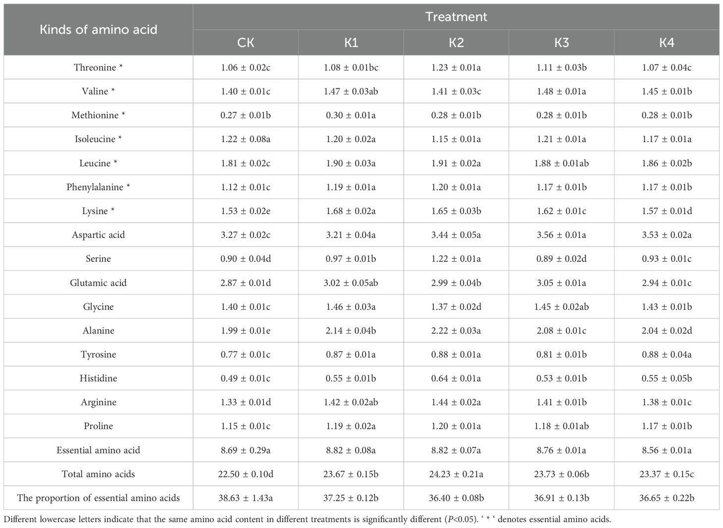 It can be seen from Table 3 that the application of potassium fertilizer had no significant effect on the content of isoleucine and essential amino acids (P>0.05). The content of isoleucine in CK was the highest and that in K2 was the lowest. The total content of essential amino acids increased first and then decreased. Except for K4 treatment, the content of essential amino acids in other treatments was higher than that of CK. There were significant effects on other types of amino acids and the proportion of total amino acids and essential amino acids (P<0.05). For the percentage of essential amino acids, the general pattern was that the percentage of essential amino acids was lower than that of CK for all fertilized treatments, in descending order of CK>K1>K3>K2>K4; there was a significant difference between CK and all the other treatments (P<0.05), whereas the differences were not significant (P>0.05) among K1, K2, K3 and K4 treatments.