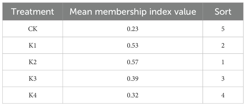 In the correlation analysis, if an index is significantly correlated with two or more indexes (the absolute value of the correlation coefficient exceeds 0.5), it shows that there is a strong correlation between the index and the quality of bamboo shoots, and it can be determined that it has a greater impact on the quality. Based on principal component analysis, correlation of each index and other influencing factors, ash, crude fiber, protein, crude fat, soluble sugar, starch, total amino acid, sweet amino acid and aromatic amino acid were finally selected to calculate the membership function value (Jing et al., 2020). According to Equations 1, 2, the average membership function values of Qiongzhuea tumidinoda shoots under five potassium treatments were calculated, and the quality was ranked (Table 6). The comprehensive ranking is as follows : K2 > K1 > K3 > K4 > CK.