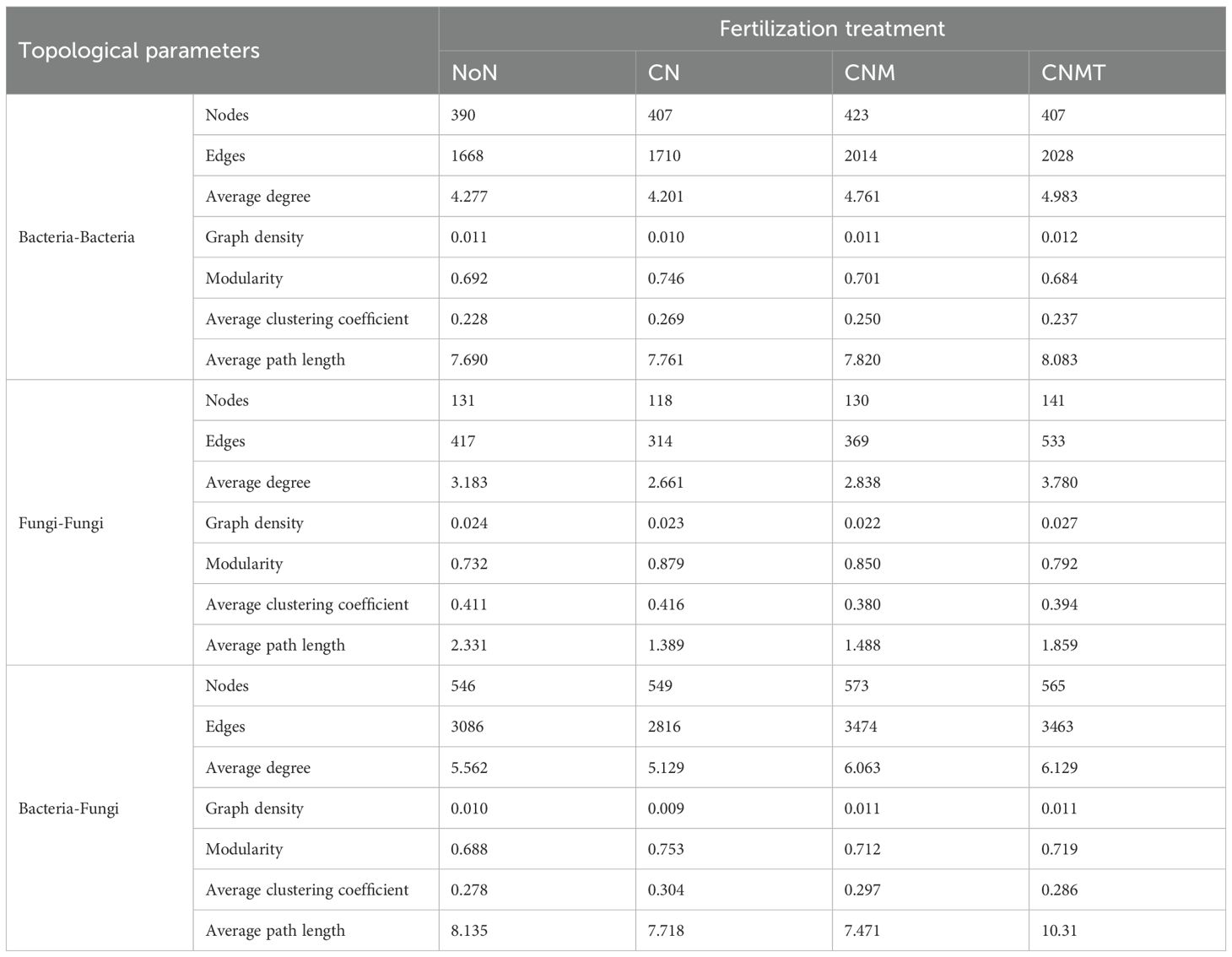 The functional annotation of prokaryotic taxa (FAPROTAX) analysis showed that the main potential functions were related to chemoheterotrophy and N cycling (Figure 3G). Compared to CN, N cycling and chitinolysis were overrepresented in CNMT in both rhizosphere and non-rhizosphere soil. Microbial interaction (bacteria-bacteria, fungi-fungi, and bacteria-fungi) networks were constructed to visualize microbial co-occurrence patterns under different fertilization regimes (Figure 4). According to the topological parameters of each network (Table 4), the bacteria-bacteria networks in CNM and CNMT exhibited higher complexity than those in NoN and CN, based on the higher note number, edge number, and average degree. The fungi-fungi network in CNMT showed higher complexity, with a higher note number, edge number, average degree, and graph density. The bacteria-fungi networks in CNM and CNMT also showed higher complexity, with a higher note number, edge number, average degree, and graph density.
