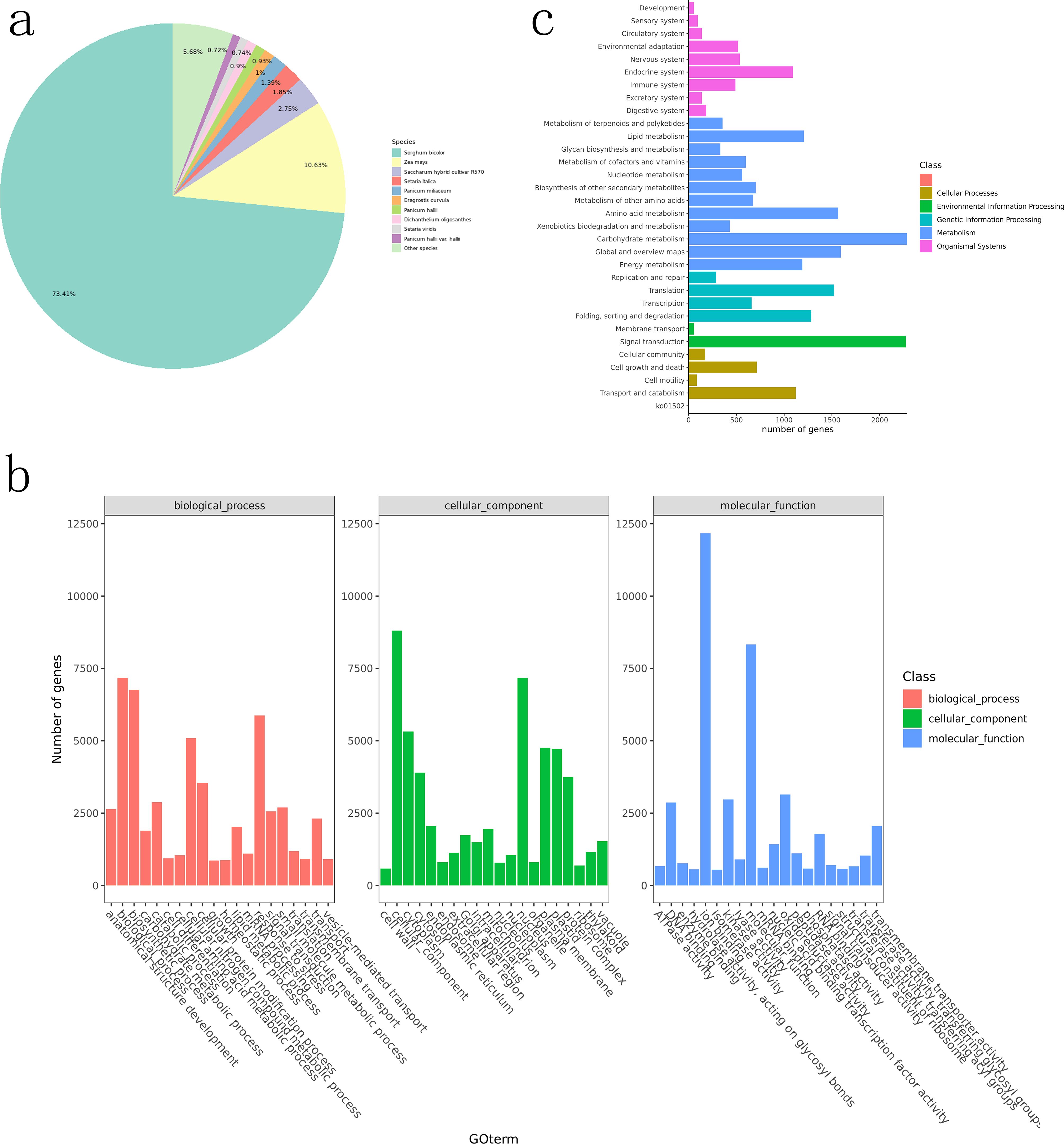 Figure 1. Functional annotation diagram. (a) statistics of Nr annotation results (species distribution map); (b) GO functional classification of unigenes; (c) KEGG Pathway classification.
