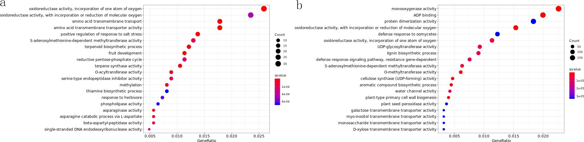 Figure 2. Go enrich dotplot. (a) ROC22-5_vs_ROC22-CK_GOenrich_dotplot; (b) ROC22-3_vs_Zz9-3_GOenrich_dotplot.