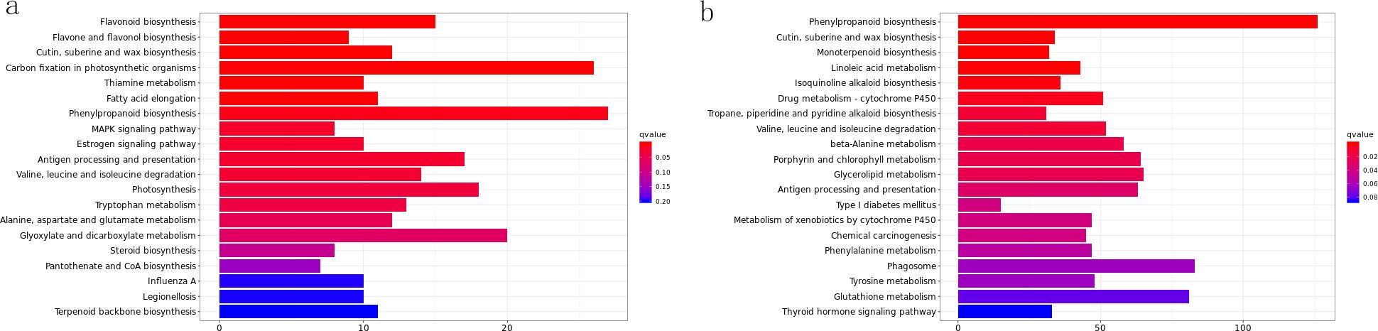 Figure 3. KEGGenrich_barplot. (a) ROC22-5_vs_ROC22-CK_KOenrich_barplot; (b) ROC22-3_vs_Zz9-3_KOenrich_barplot.