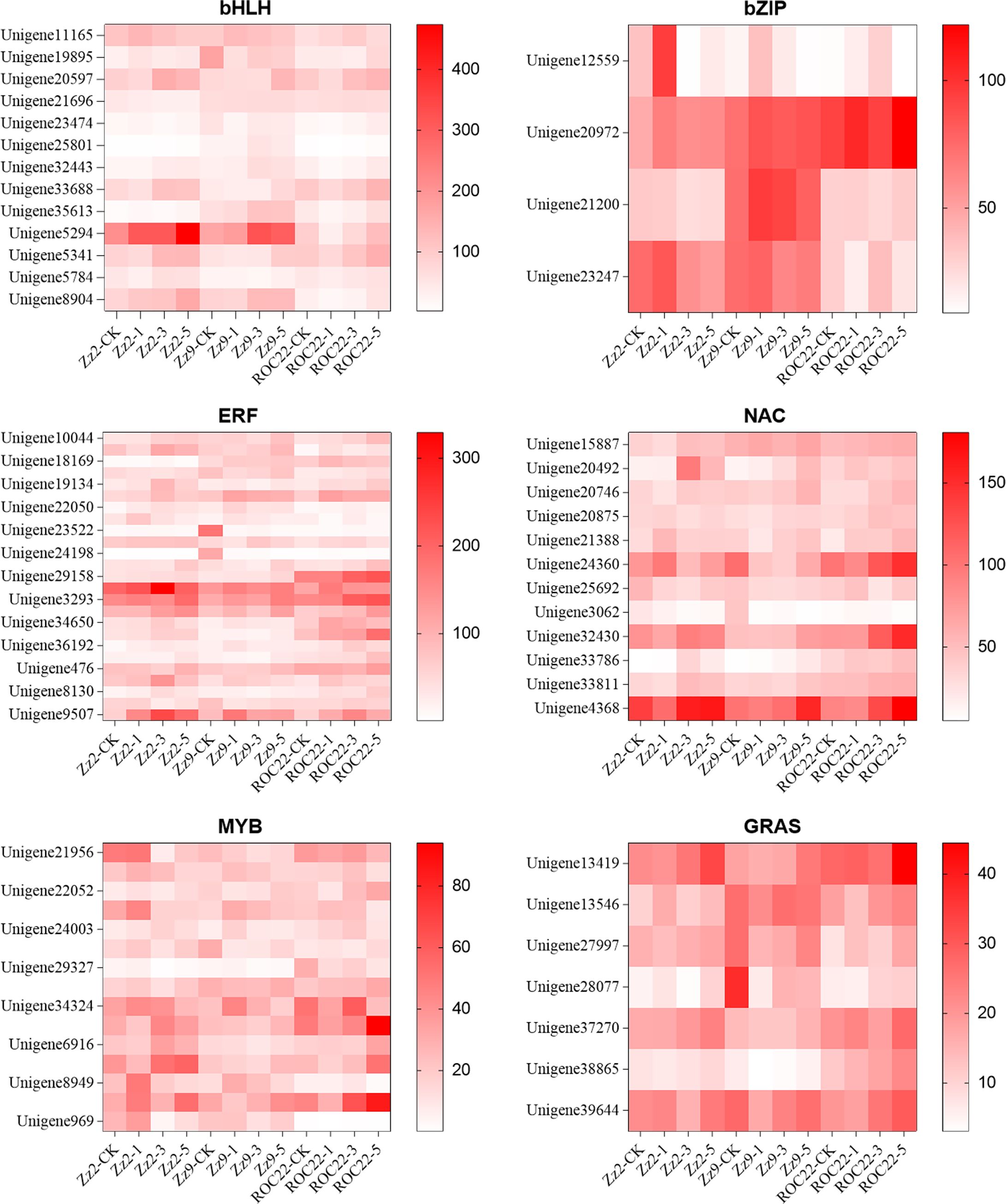 We selected the bHLH, bZIP, ERF, NAC, MYB-related, MYB, and GRAS families for cluster analysis. Each gene had at least one FPKM value >20 and a fold change >2. Figure 4 shows that Unigene20597 (FPKM = 428), Unigene33688 (FPKM = 417), and Unigene5341 (FPKM = 433) are bHLH35 transcription factors. All three genes exhibited high expression in ROC22, suggesting they may play critical roles in drought stress; Unigene21200 (FPKM = 339) is not annotated as a bZIP, but exhibited higher expression in ZZ9 and lower expression in ZZ2 (FPKM = 114) and ROC22 (FPKM = 117), suggesting it may positively regulate drought stress responses.