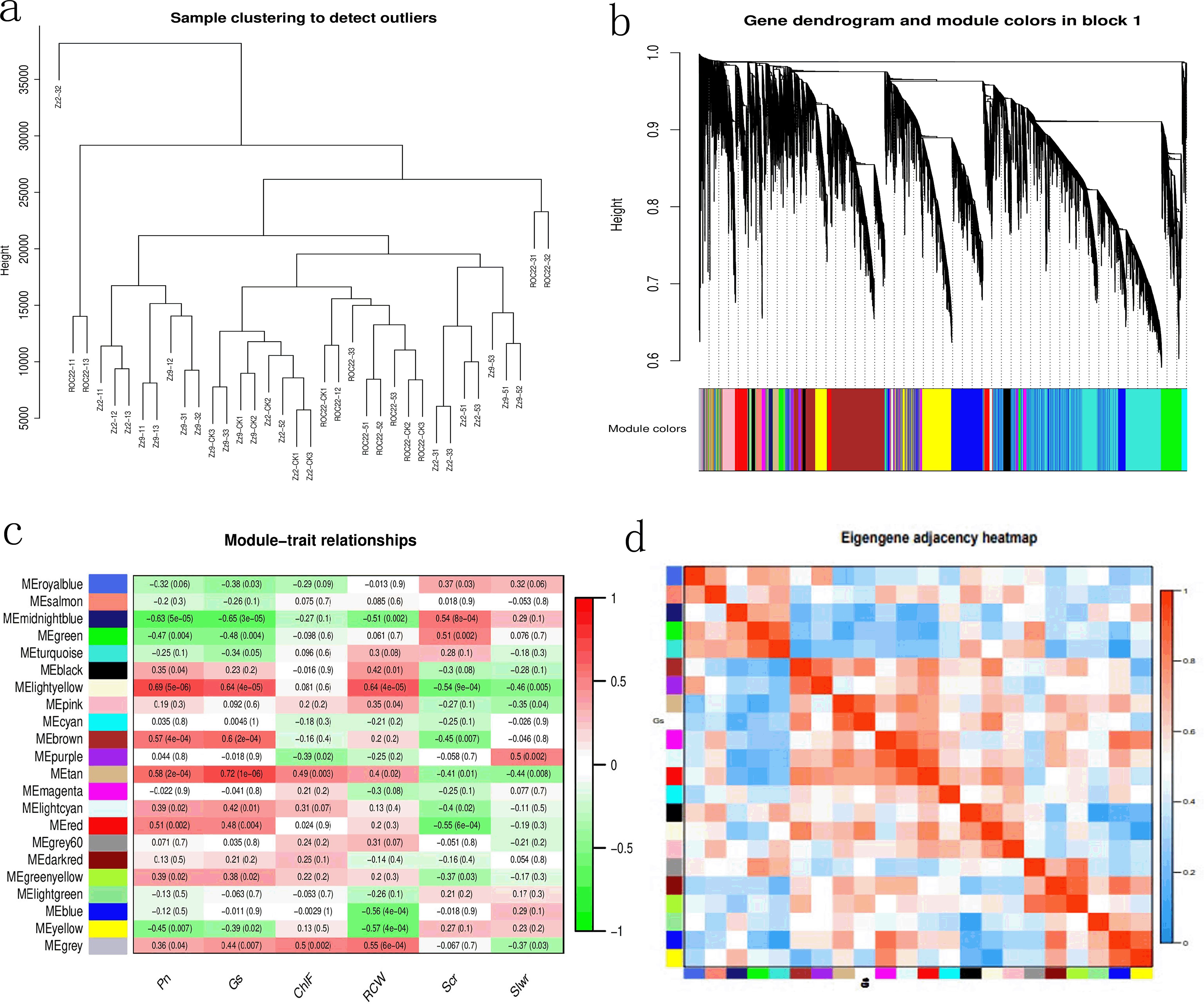 Figure 5. Correlation analysis between sample phenotypes and modules. (a) Sample clustering results; (b) Gene cluster diagram of Block 1, showing module correspondence; (c) Statistical results of module-trait correlations; (d) Heatmap of Gs-module correlations.