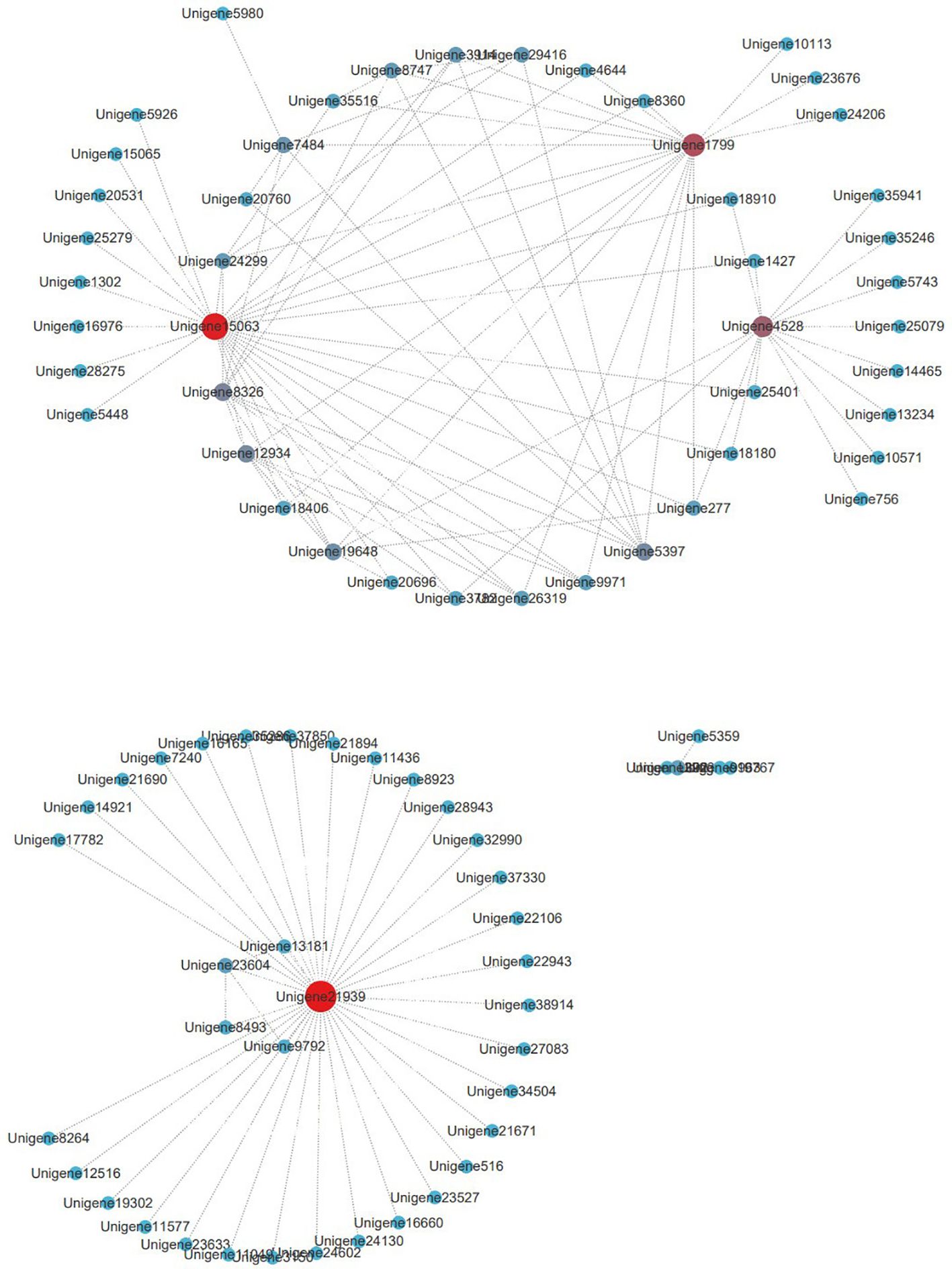 Gene co-expression weights in the tan module were calculated, and genes with weights >0.25 were selected for visualization and analysis. Cytoscape visualization was performed for 132 genes in the tan module (Figure 6). Four hub genes were identified: Unigene21939, Unigene15063, Unigene1799, and Unigene4528, which play key regulatory roles in the tan module.