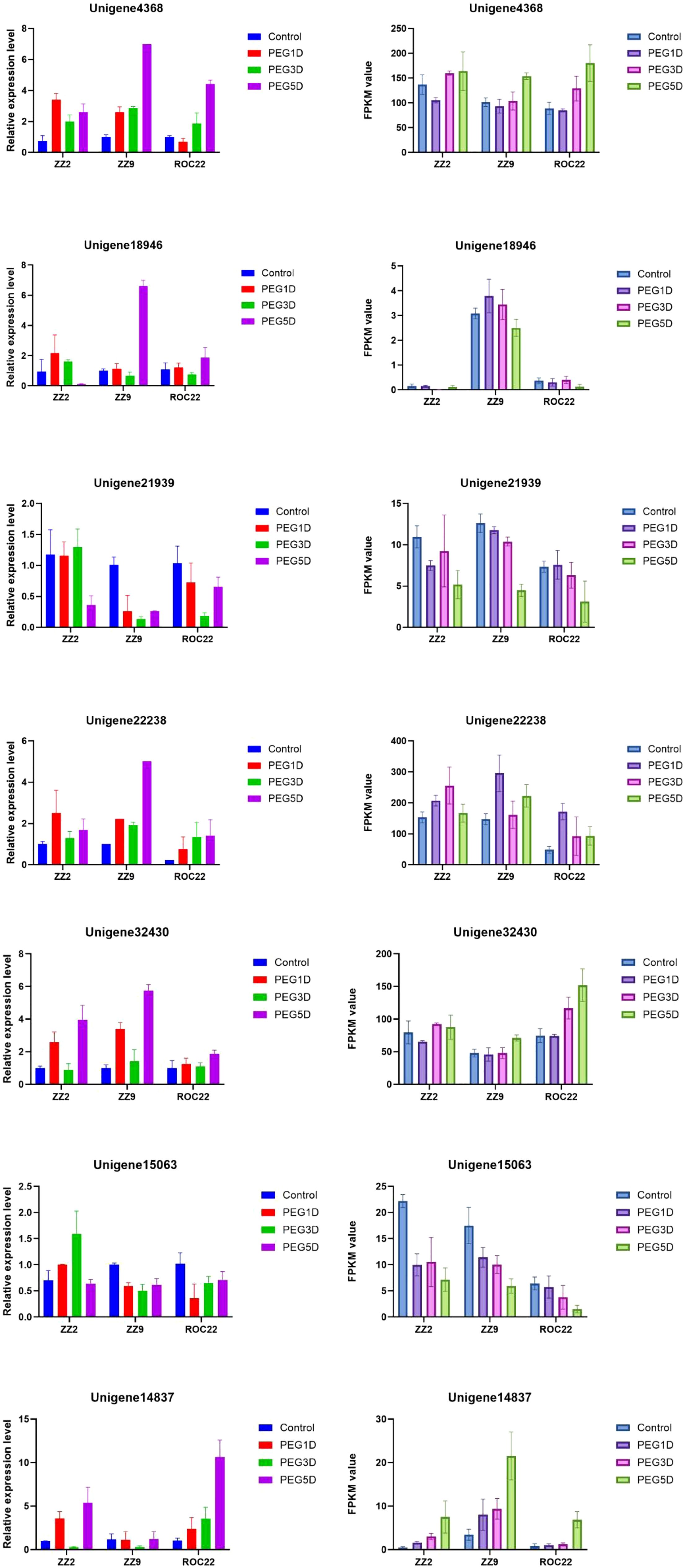 Among GRAS family transcription factors, Unigene13419 and Unigene37270 exhibited lower expression in ZZ9 but higher expression in ZZ2 and ROC22. In ZZ9, their expression gradually increased with drought duration, suggesting they positively regulate drought stress responses. In contrast, Unigene13546 exhibited higher expression in ZZ9 (FPKM = 100) than in ZZ2 (FPKM = 51) and ROC22 (FPKM = 75); its expression was further upregulated after drought treatment compared with the control, indicating it is a positive regulator.