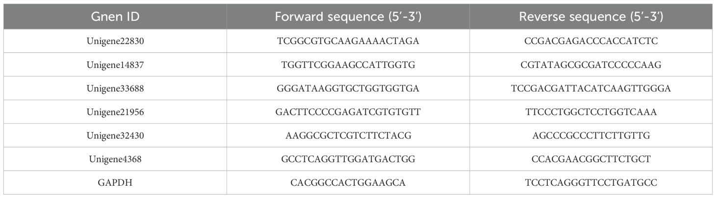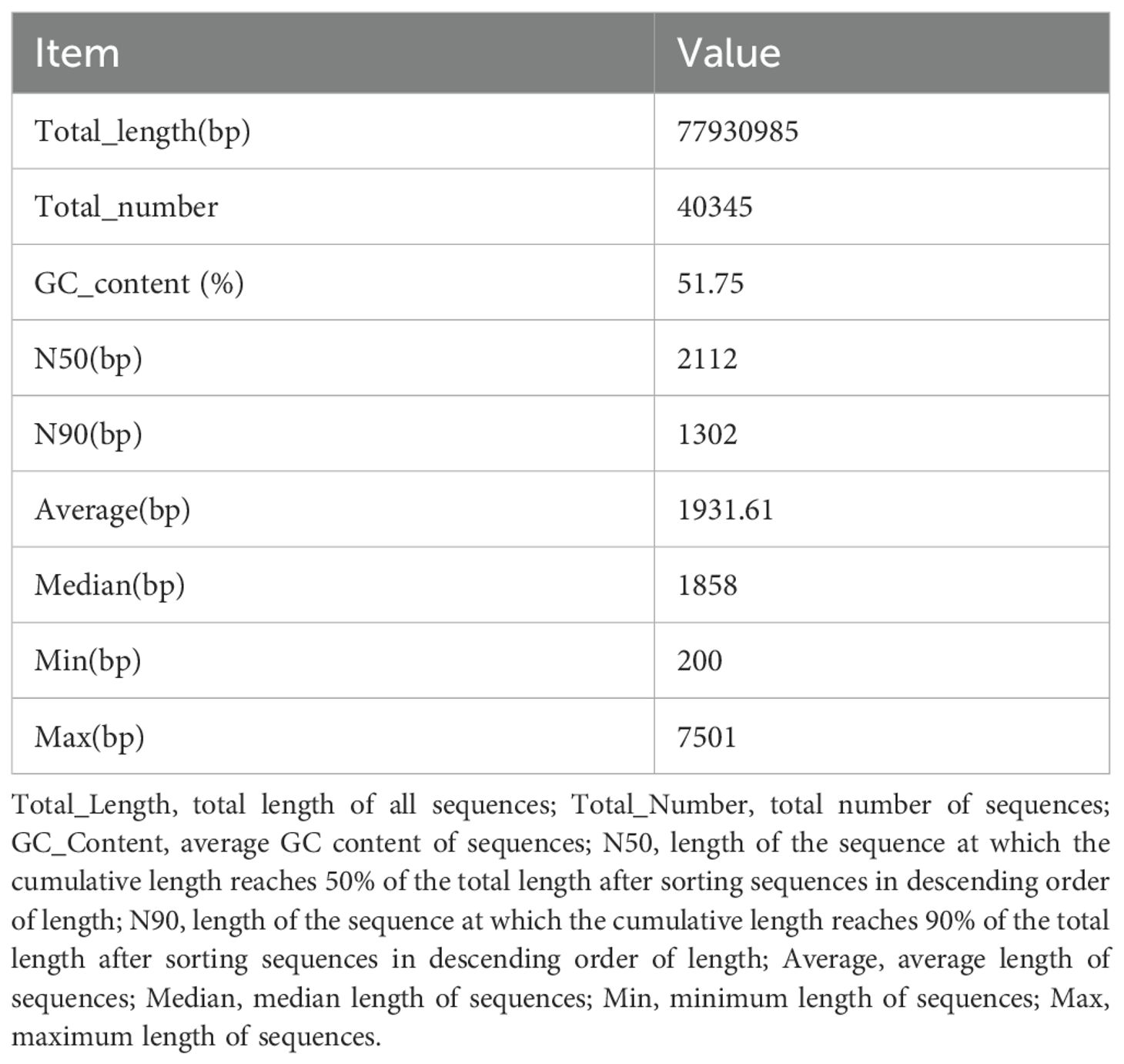 Sequence alignment and functional annotation were performed using BLAST (Altschul et al., 1997) and DIAMOND (Buchfink et al., 2015), with gene annotations obtained from seven databases (UniProt, KEGG, GO, Nr, PFAM, eggNOG, and KEGG Pathway). Gene expression levels were quantified using RSEM (Li and Dewey, 2011), and differential expression analysis was conducted using DESeq2 (Anders and Huber, 2010). Differentially expressed genes were subjected to GO and KEGG enrichment analyses.