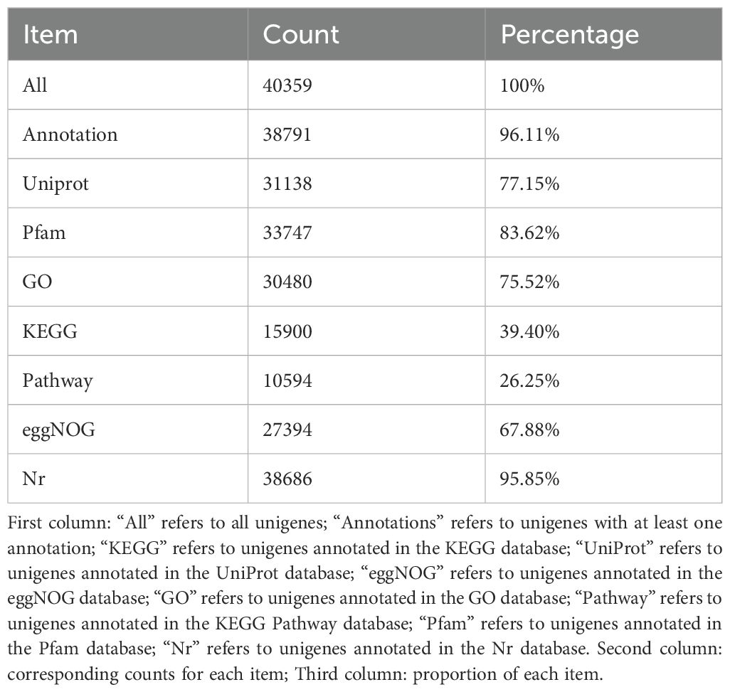 To obtain comprehensive gene functional information, SMRT sequencing transcriptomes and de novo assembled short-read transcriptomes were annotated via BLAST (http://blast.ncbi.nlm.nih.gov/Blast.cgi) by matching known proteins in UniProt, KEGG, GO, Nr, PFAM, eggNOG, and KEGG Pathway databases. Statistical results are shown in Table 4. The total number of unigenes was 40,359. Of these, 38,791 unigenes were annotated (96.11% of the total). The Nr database annotated the most unigenes (38,686, 95.85%) via BLAST, while KEGG Pathway annotation had the lowest proportion (26.25%). Notably, 1,568 unigenes remained unannotated, suggesting they may be novel genes. GO and KEGG annotated 30,480 and 15,900 unigenes, respectively.