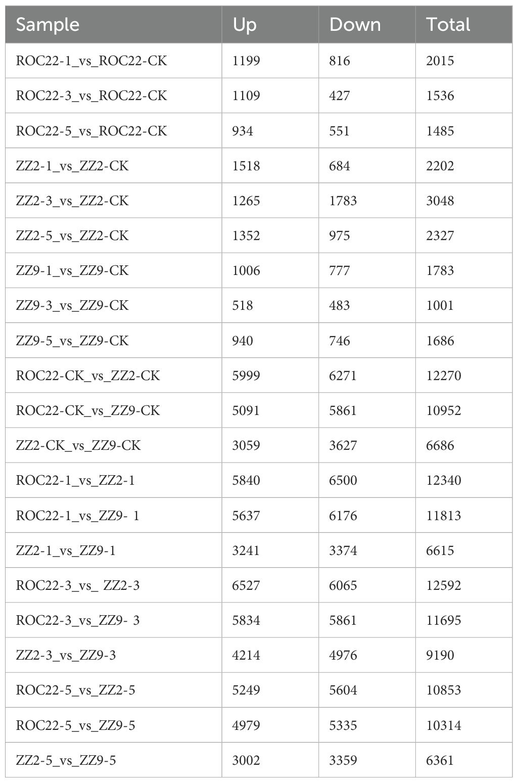 Intraspecific analysis showed ROC22–1 had the most DEGs (2,015), and ROC22–5 had the fewest (1,485). In ROC22-3, upregulated DEGs were more than twice the number of downregulated DEGs. ZZ2–3 had the most DEGs (3,048), while ZZ2–1 had the fewest (2,202). For ZZ9, ZZ9–3 had the fewest DEGs (1,001), and ZZ9–1 had the most (1,783).