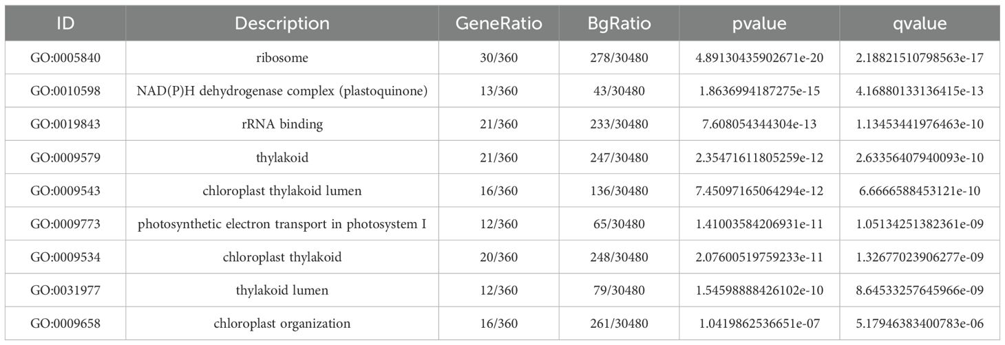 Subsequently, GO and KEGG enrichment analyses were performed. In Table 6. GO enrichment included 360 genes, with the most abundant terms being ribosome (30 genes), rRNA binding (21 genes), and thylakoid (21 genes). Forty-two GO terms were significantly enriched (p<0.05), with photosynthesis-related terms being the most abundant. Other significantly enriched terms included NAD(P)H dehydrogenase complex (plastid quinone), photosynthetic electron transport in photosystem I, photosynthesis, photosystem II components, glycolysis, fructose diphosphate aldolase activity, fructose 1,6-diphosphate metabolism, and auxin biosynthesis.