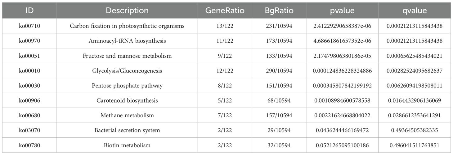 In Table 7, KEGG enrichment included 122 genes across 94 metabolic pathways. Notably, carbon fixation in photosynthetic organisms, fructose and mannose metabolism, aminoacyl-tRNA biosynthesis, and glycolysis/gluconeogenesis were significantly enriched.