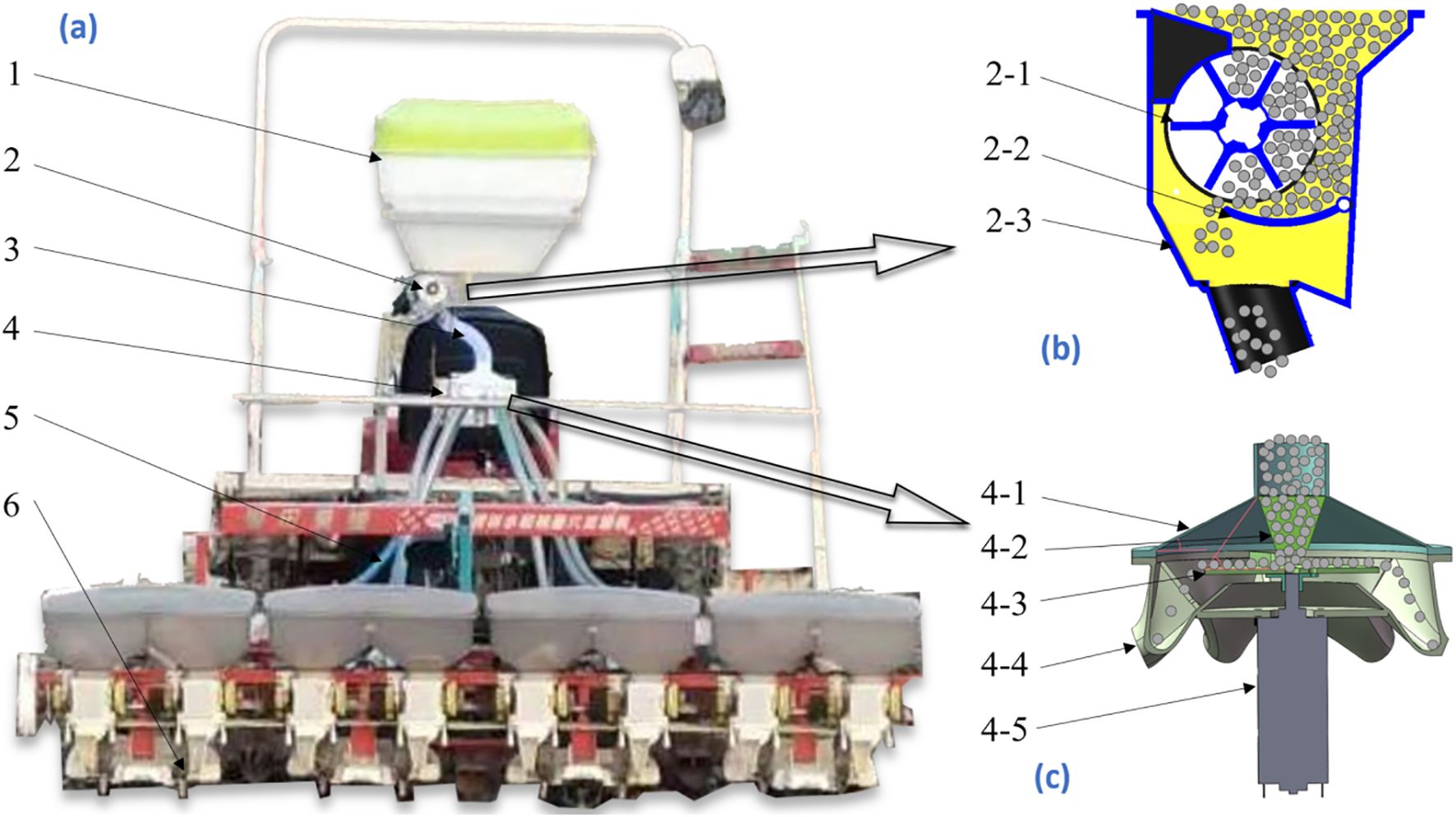 Figure 1. Overall structure of adaptive centrifugal distribution side deep fertilizer application device. (A) Overall structure. (B) Trough wheel type fertilizer discharger. (C) Distributor. 1 Fertilizer bin, 2 Trough wheel type fertilizer discharger, 3 Connecting tube, 4 Distributor, 5 Discharge tube, and 6 Trench opener.2–1 Trough wheel, 2–2 Fertilizer discharging tongue, and 2–3 Housing. 4–1 Distributor top cover, 4–2 Receiving hopper, 4–3 Centrifugal disc, 4–4 Distribution chamber, and 4–5 Motor.