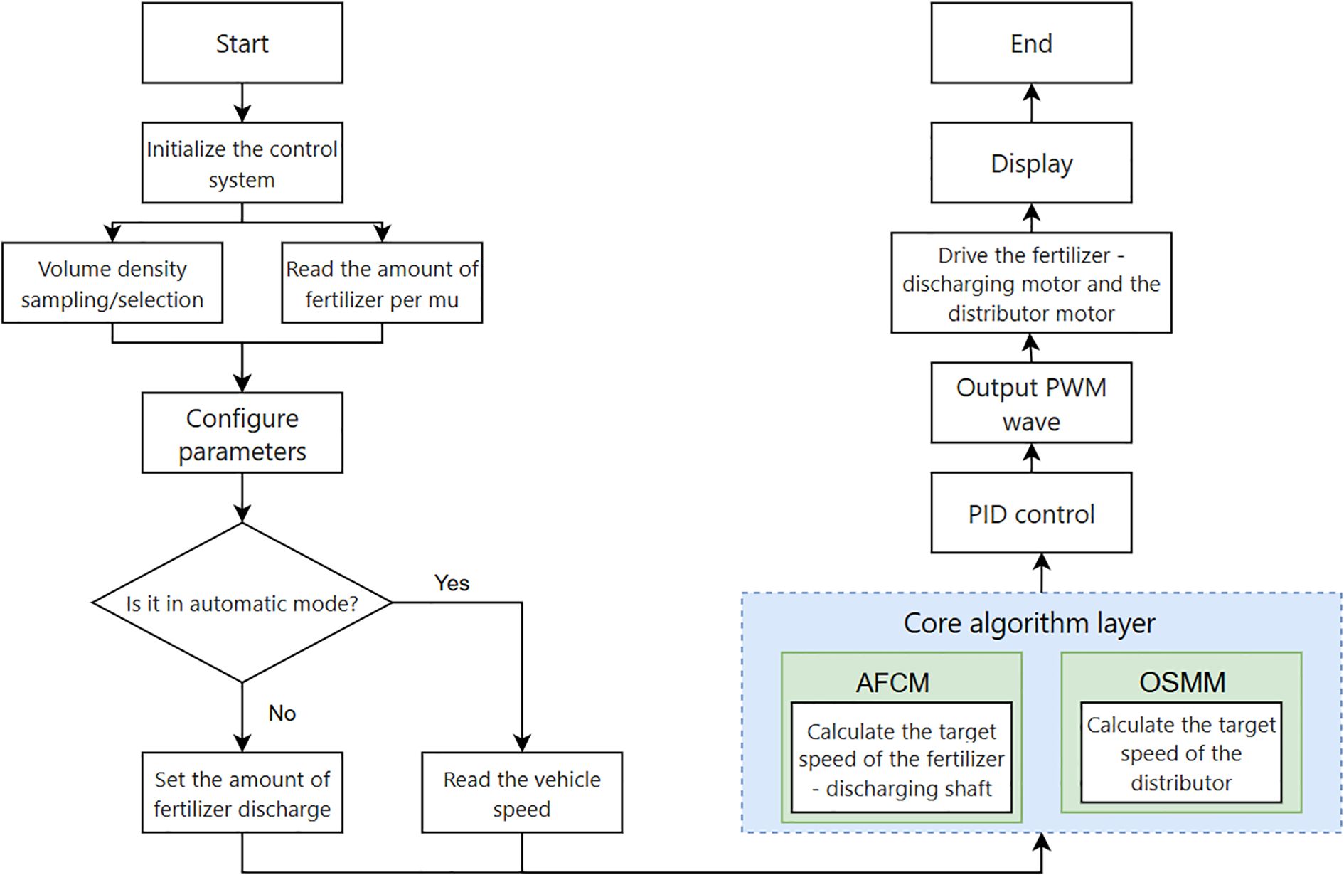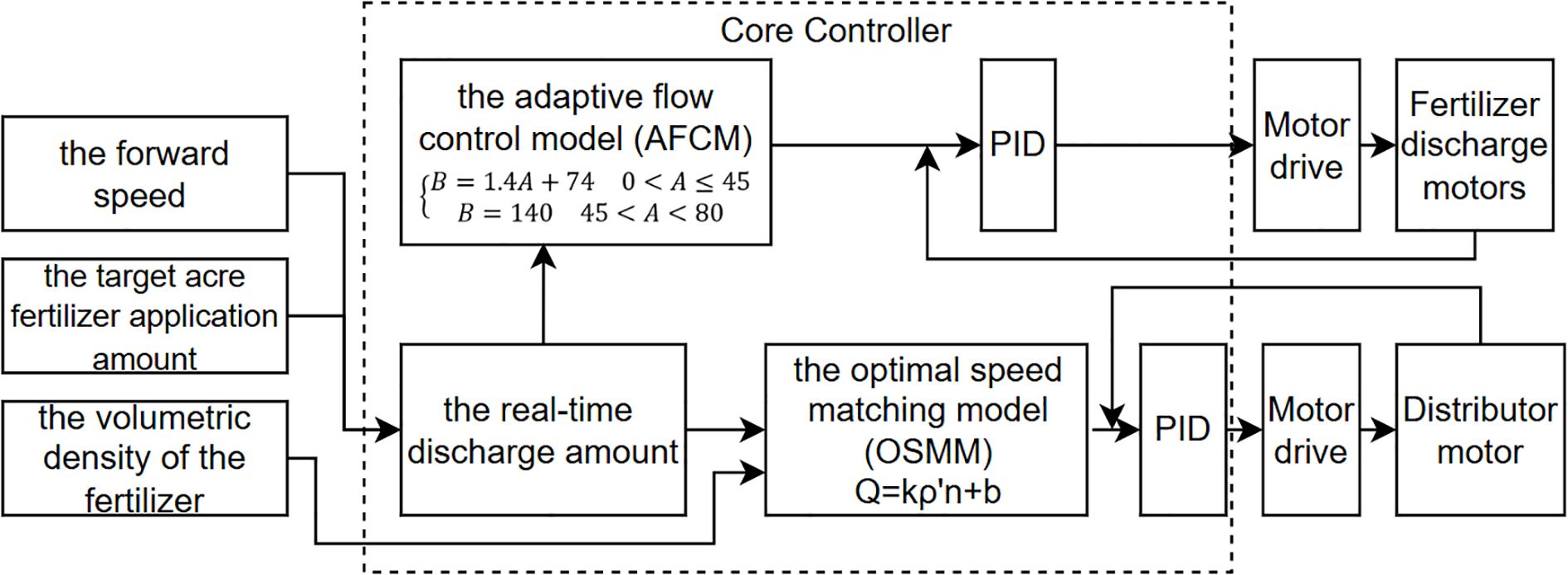 Prior to fertilizer applicator operation, the driver could adjust the target fertilizer application amount per acre using the knob on the controller. The Microcontroller Unit (MCU) controller calculated the target acre fertilizer application amount and forward speed of the fertilizer applicator as the inputs of the control system to derive the real-time required fertilizer discharge flow rate (Alameen et al., 2019). This flow rate and the fertilizer bulk density are inserted into the adaptive flow control model (AFCM) to calculate the fertilizer discharge shaft speed of the real-time discharge amount. Subsequently, the PID algorithm was employed to calculate the pulse width modulation (PWM) duty cycle for the control system output (Wang, H. et al., 2023). The real-time fertilizer discharge shaft speed control quantity was determined, and the required output PWM duty cycle of the control system was calculated using the PID algorithm (Wang, H. et al., 2023). The PWM signal was subsequently amplified by an opto-coupler isolated control drive circuit to control the real-time speed of the motor, thereby achieving precise control of the fertilizer application quantity. At the same time, the fertilizer discharge flow rate was input into the optimal speed matching model (OSMM) of the distributor to calculate the optimal distributor speed, while the PID algorithm was used to control the speed of the distributor in a closed loop. A control schematic for the synchronized fertilizer discharge control system is presented in Figure 2.
