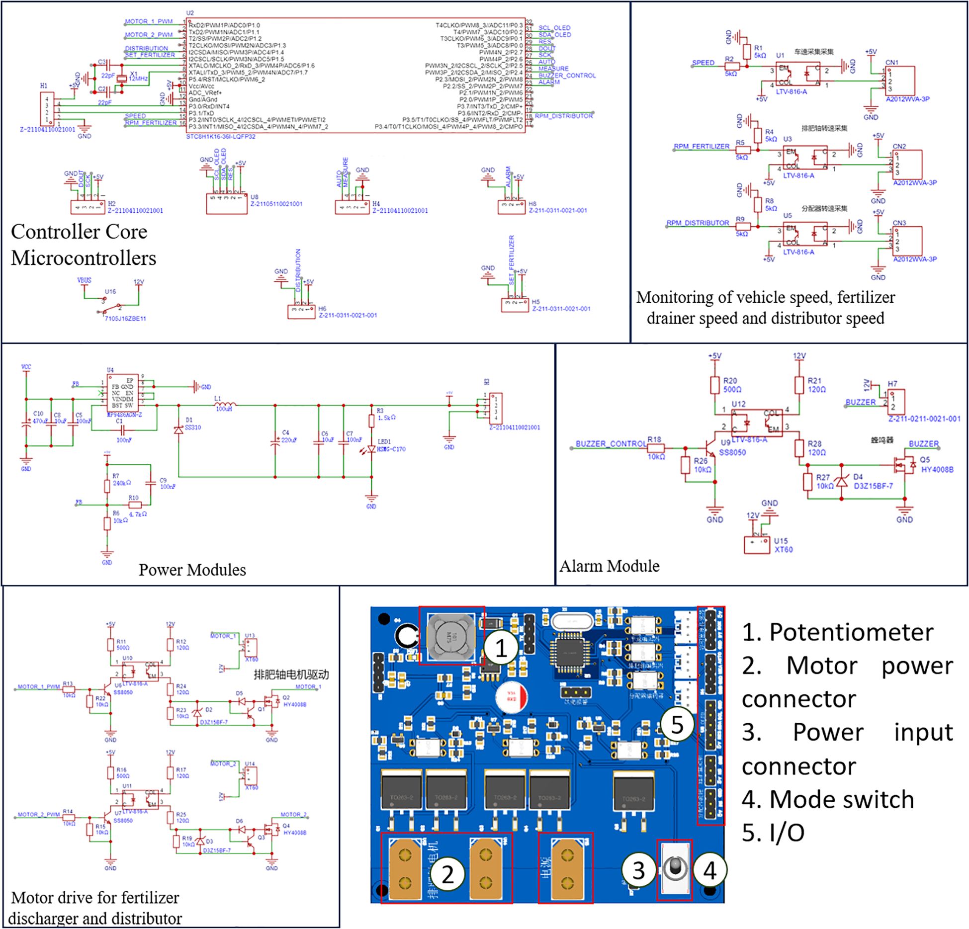 Based on the above design principles, this study will develop a mechanical centrifugal distribution type, one-unit six-row side-deep fertilization device, whose main components include quantitative fertilizer discharge via a grooved wheel and centrifugal distribution by a disc. The overall mass of the fertilizer application unit is anticipated to decrease greatly because of the absence of a blower. Subsequently, a PCB peripheral circuit was designed using the STC8H1K16-36I-LQFP32 main control chip. By analyzing the fertilizer discharge model and the motion trajectories of fertilizer particles on the disc, an Adaptive Flow Control Model (AFCM) based on bulk density was developed for fertilizer discharge to achieve quantitative fertilizer discharge, and an Optimal Speed Matching Module (OSMM) was designed for the distributor to realize inter-row uniformity. Finally, the fertilizer application uniformity of the centrifugal distribution side-deep fertilization device and the effectiveness of its control system will be verified in field tests.