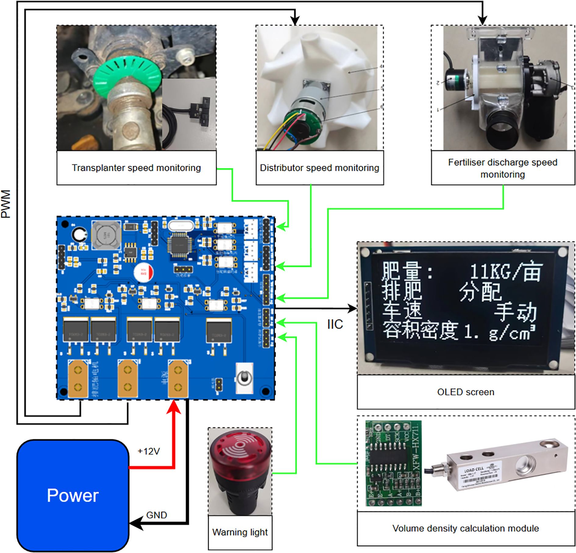 The control system of the adaptive centrifugal distribution fertilizer applicator primarily consisted of nine modules: power output shaft speed measurement (vehicle speed measurement module), fertilizer discharge shaft speed measurement, distributor speed measurement, bulk density measurement, motor drive, alarm, human-computer interaction, display, and power supply modules as shown in Figure 4.