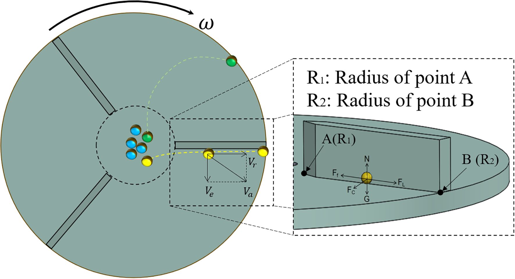 The friction coefficient () is a fixed parameter. Crucially, the radius at point A must be sufficient to ensure fertilizer lands on the disc, avoiding the fan blades. However, excessively increasing R1 can lead to runaway accumulation of fertilizer particles, as exemplified by the green particles in Figure 6. Therefore, R1 should be designed to be slightly larger than the diameter of the fertilizer outlet. The trajectory of the fertilizer particles is primarily governed by the rotational speed (ω). Therefore, Section 4.2 determines the optimal rotational speed of the disc under varying fertilizer flow rates through a full-factor test and develops the OSMM.