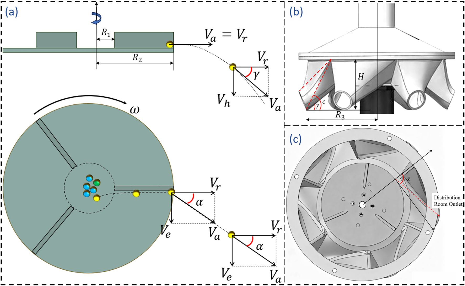 The centrifugal distributor was mainly composed of an upper cover, centrifugal disc, flange, distribution chamber, and motor, as illustrated in Figure 1C.