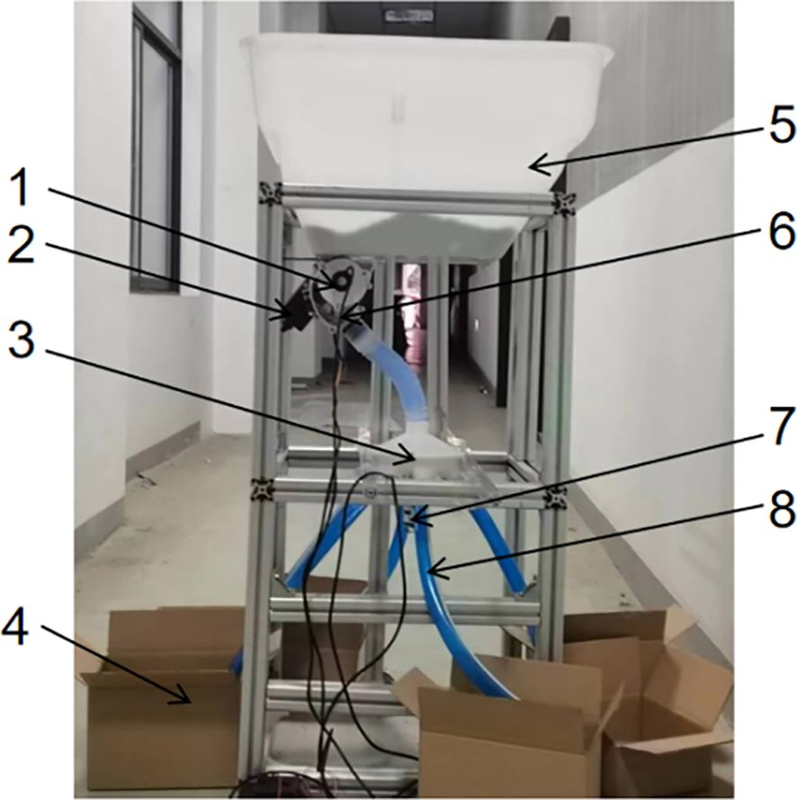 Figure 8. Centrifugal distributor test stand. 1. fertilizer discharger motor encoder 2. fertilizer discharger motor 3. distributor 4. fertilizer receiver box 5 fertilizer box 6. external grooved wheel fertilizer discharger 7. distributor motor 8. fertilizer delivery tube.