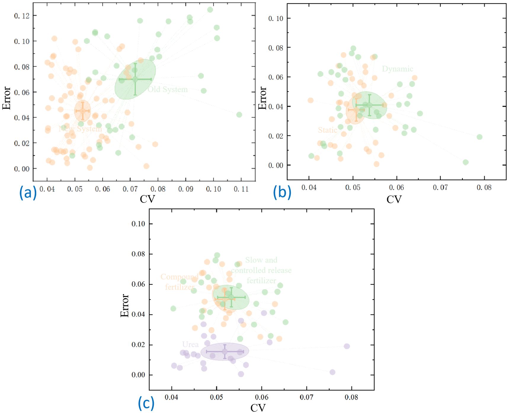 This section seeks to analyze the differences between the errors in the amount of fertilizer discharged and the coefficients of variation across rows for old and new systems, operating conditions, and fertilizers using visual scatter plots.