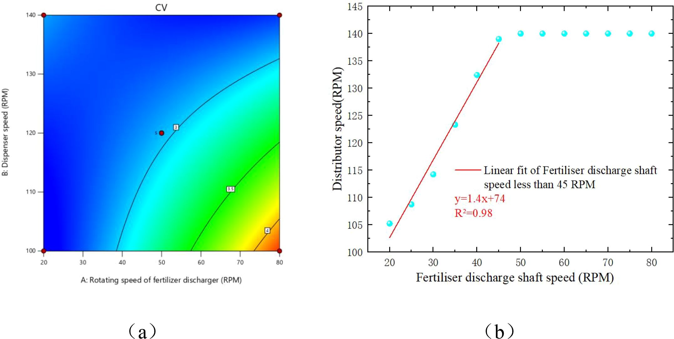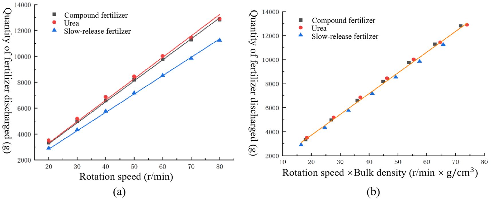 where n is the rotational speed of the fertilizer discharge shaft, rpm; k is the slope of the fitted curve; is the bulk density of the fertilizer; and b is the intercept of the fitted curve.