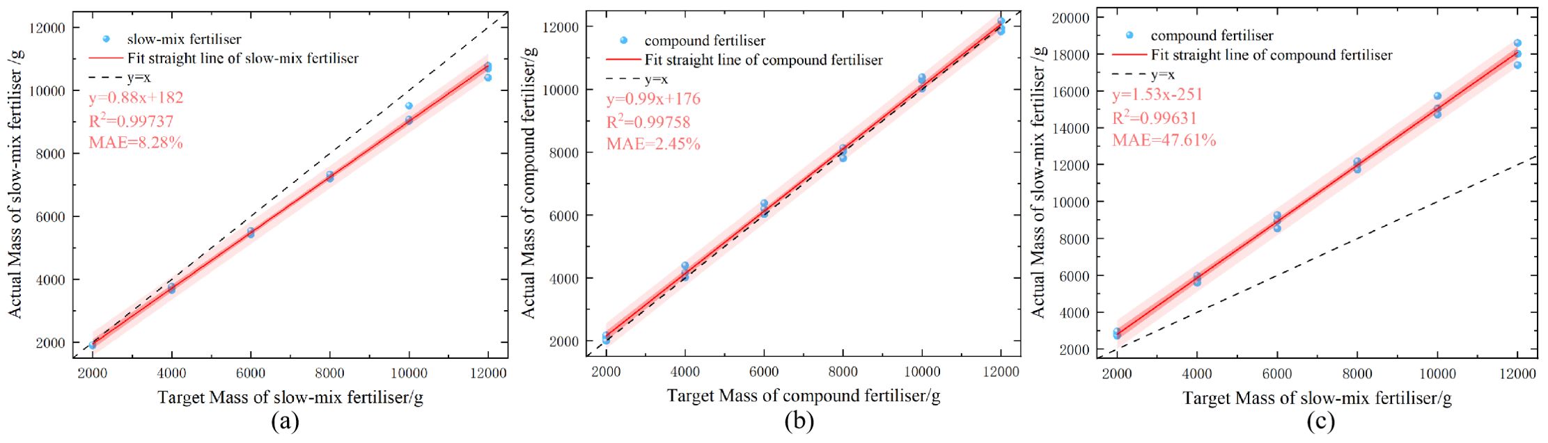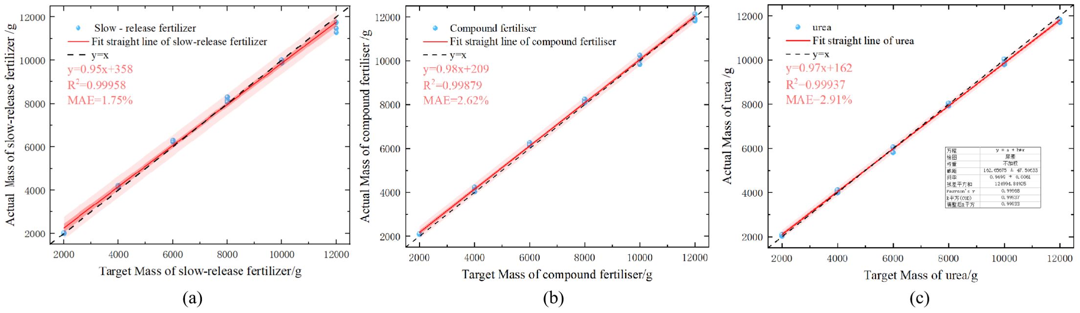 (Equation 2) is solely applicable to a specific type of fertilizer, and the error increases upon switching fertilizers; therefore, recalibration is necessary. Different fertilizer types have different bulk densities. We incorporated bulk density as an auxiliary parameter for fitting the linear primary term coefficients in the calibration formula and established a new calibration formula (Equation 3):