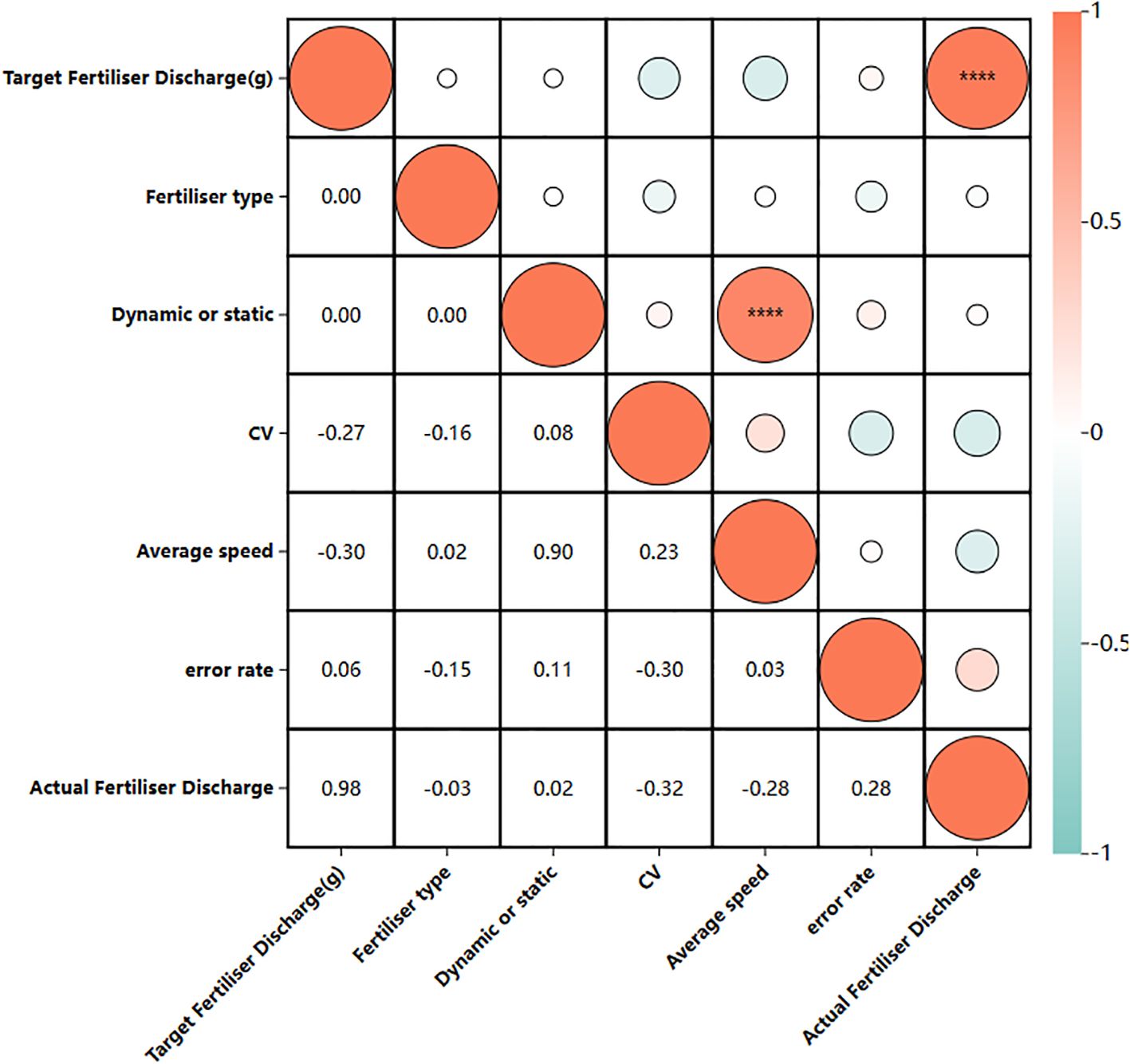 Figure 15 illustrates the verification of the anti-interference capabilities of the new fertilizer discharge control system via Pearson correlation analysis. The analysis utilized data from the dynamic/static test (static code “1” speed is 0, dynamic code “2”). The fertilizer types examined included slow-mixed fertilizer, compound fertilizer, and urea, which were categorized according to their bulk density in ascending order (coded as 1/2/3). The results showed that the target fertilizer discharge and the actual amount of fertilizer discharged were strongly positively correlated (r > 0.8). Additionally, test-type coding was significantly correlated with vehicle speed, which aligned with system design expectations. The correlation coefficients between fertilizer type and discharge error rate and row-by-row CV were -0.15 and -0.16, respectively (absolute value<0.3 threshold), thereby confirming that differences in the physical properties of fertilizers (e.g., urea bulk density is 18.4% lower than compound fertilizer) had a weak effect on accuracy. The correlation coefficients between dynamic/static conditions and discharge error and CV were only 0.11 and 0.08, indicating that vibration and other disturbing factors were suppressed and the system was resistant to environmental impact. The correlation coefficients of dynamic/static working conditions and fertilizer discharge error and CV were merely 0.11 and 0.08, indicating that field vibration and other disturbing factors were suppressed.