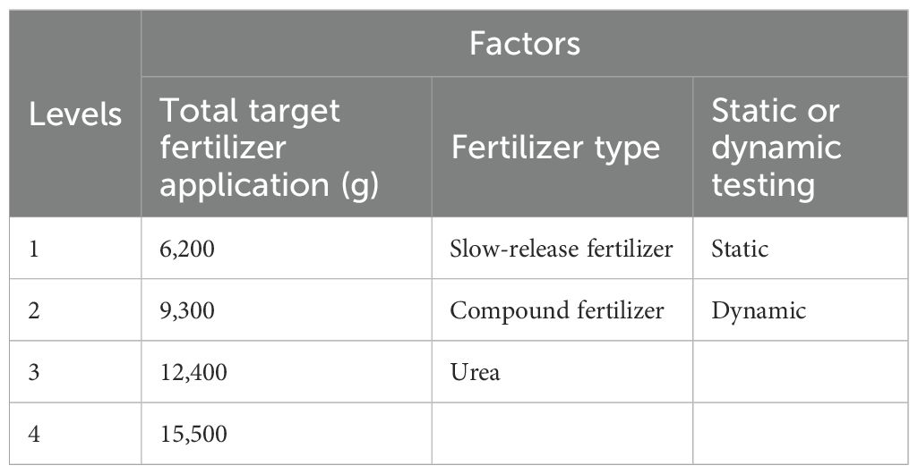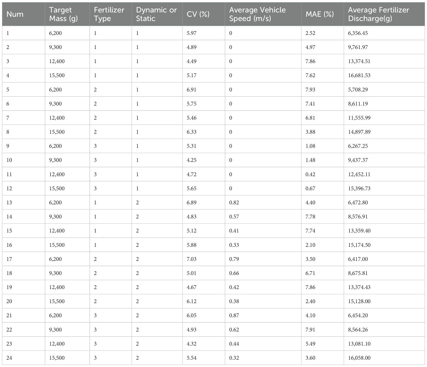 The overall machine test served three primary purposes: to test and verify the field operation effect of the centrifugal distribution fertilizer applicator; to observe the adaptability of the centrifugal fertilizer discharge system to different fertilizers; and to compare and verify the effectiveness of the control system (refer to the GB/T 20346.1–2006 Test Methods for Fertilizer Applicators). The entire machine test encompassed both dynamic and static evaluations. The mu sowing amount and fertilizer type were selected as test factors. The mu sowing amount ranged from 20 to 50 kg, with four levels chosen. Each operational run covers 100 m, with an operational width of 2.1 m. Consequently, the total target fertilizer application amounts of the four levels were 6,200 g, 9,300 g, 12,400 g, and 15,500 g when a large amount of mu was sown. The speed of the rice transplanter was reduced to achieve the desired total amount of fertilizer application. The target fertilizer discharge rate in the static test was the same as that in the dynamic test. Each group of tests was conducted in triplicate. The actual total amount of fertilizer discharged from the six fertilizer discharge tubes was measured, and the error rate of fertilizer discharge and coefficient of variation between rows were calculated. Simultaneously, the vehicle speed in the dynamic test was monitored using the control system, while the average value of the vehicle speed was recorded. The vehicle speed was used to correlate the experimental results. The experimental design is presented in Table 1.