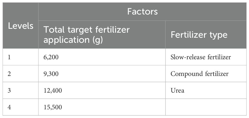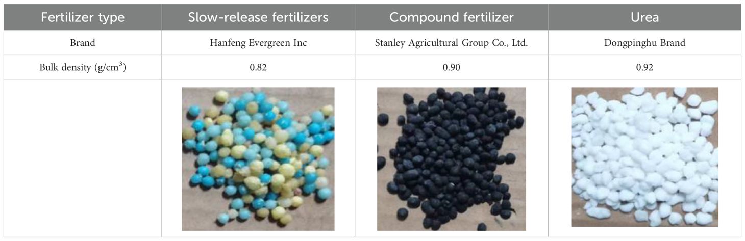 The test materials encompassed cardboard boxes, handheld electronic scales, stopwatches, tape measures, and data-recording forms. Three fertilizer types were selected: slow-release fertilizer, urea, and compound fertilizer. The specific brands and physical properties of the fertilizer types are shown in Table 3.