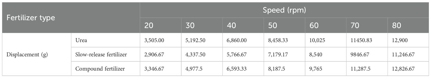 The rotational speed of the fertilizer discharge shaft was selected as 20–80 rpm, with increments of 10 rpm, resulting in seven distinct levels. Urea, compound fertilizer, and slow-mixed fertilizer were selected as the test objects, with a 1-min fertilizer discharge time. The test results are presented in Table 4 (each test group was performed in triplicate to obtain the average value).