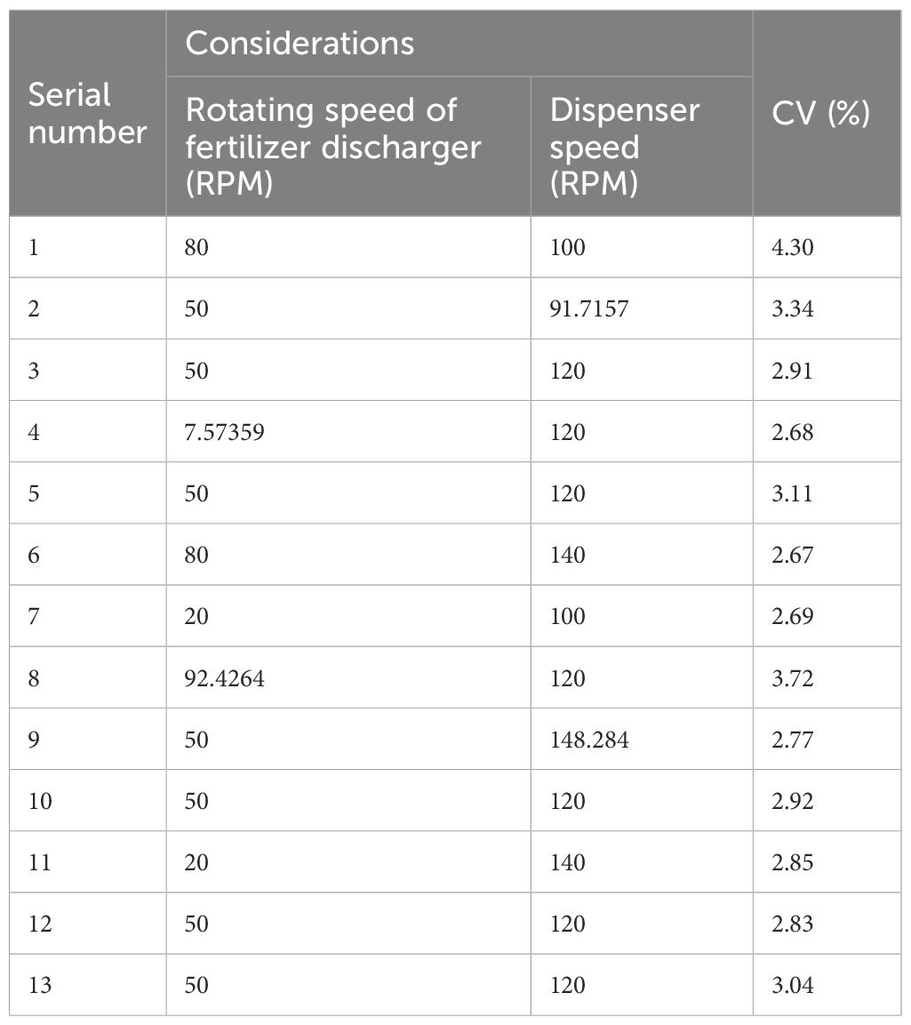 (1) Coefficient of variation for consistency of fertilizer discharge across rows.