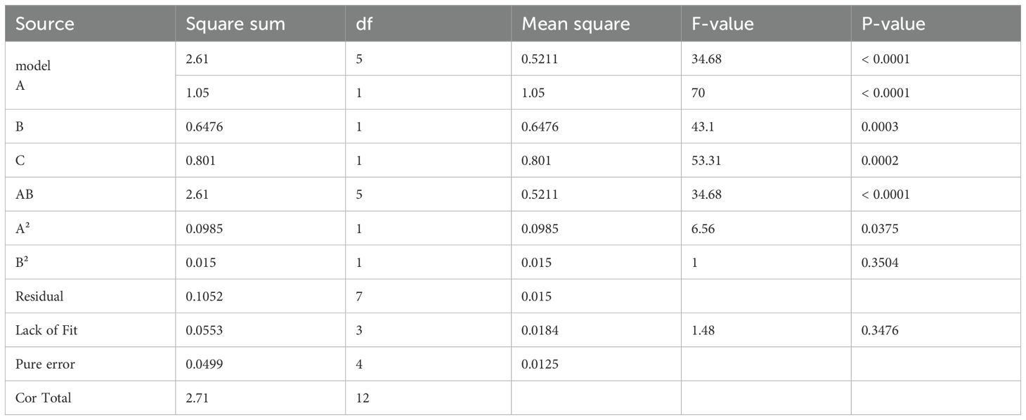 From the test results, the CV for row-wise consistency varied between 2.67% and 3.72%. The ANOVA results of the response surface tests using the CCD-RSM method are listed in Table 6. The F-value of the regression equation was 34.68, the P-value was<0.001, and the model achieved a highly significant level. This indicates that the model has good fitting accuracy and can be used to conduct subsequent design optimization using the response surface approximation model. The P-value of the deformation term was 0.3476 (P > 0.05), indicating that the deformation term was not significant and that the model had a good degree of fit. From the size of the F-value of each factor in the table, it can be concluded that the effect of the fertilizer discharger rotational speed on the CV was higher than that of the distributor rotational speed. The R2 of the regression model was 0.9612, and the difference between the predicted R2 (0.8263) and adjusted R2 (0.9335) was less than 0.2, which indicated that the model was well-fitted; the measured signal-to-noise ratio was 19.4554 > 4, indicating that the signals were adequate; and the CV value was 4.00%< 10%, indicating that the test had high confidence and accuracy.