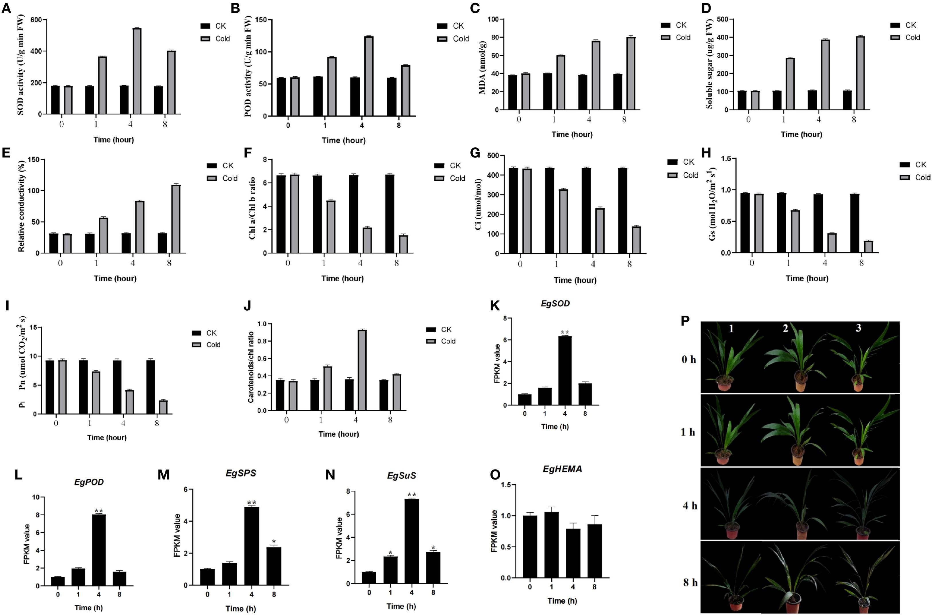 Figure 1. Effects of cold stress on the growth phenotype and physiological indices of oil palm seedlings. (A–J) Assessment of physiological and biochemical parameters in oil palm subjected to control and cold stress conditions at 0, 1, 4, and 8 hours of exposure. Data are presented as mean ± SD (n = 3). (K–N) FPKM value of SOD, POD, SPS, SuS, and HEMA genes under cold stress conditions. Asterisks represent significant difference at p ≤ 0.05(*) and p ≤ 0.01(**). (P) Growth phenotypes of seedlings from different treatment groups after the stress period. 1–3 means three biological replicates.