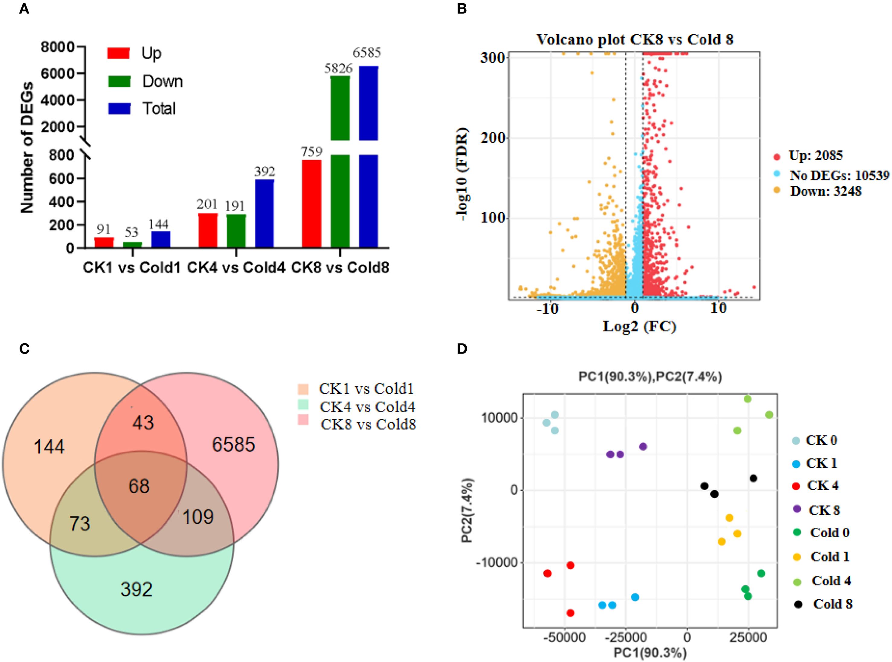 Four-panel image showing different data visualizations. A: Bar graph displaying up, down, and total numbers of differentially expressed genes (DEGs) across CK1 vs Cold1, CK4 vs Cold4, and CK8 vs Cold8. B: Volcano plot of CK8 vs Cold8 with DEGs highlighted, showing 2085 up, 3248 down, and 10539 non-DEGs. C: Venn diagram illustrating shared and unique DEGs for CK1 vs Cold1, CK4 vs Cold4, and CK8 vs Cold8. D: PCA plot displaying variability among samples CK0, CK1, CK4, CK8, Cold0, Cold1, Cold4, Cold8 along the first two principal components.