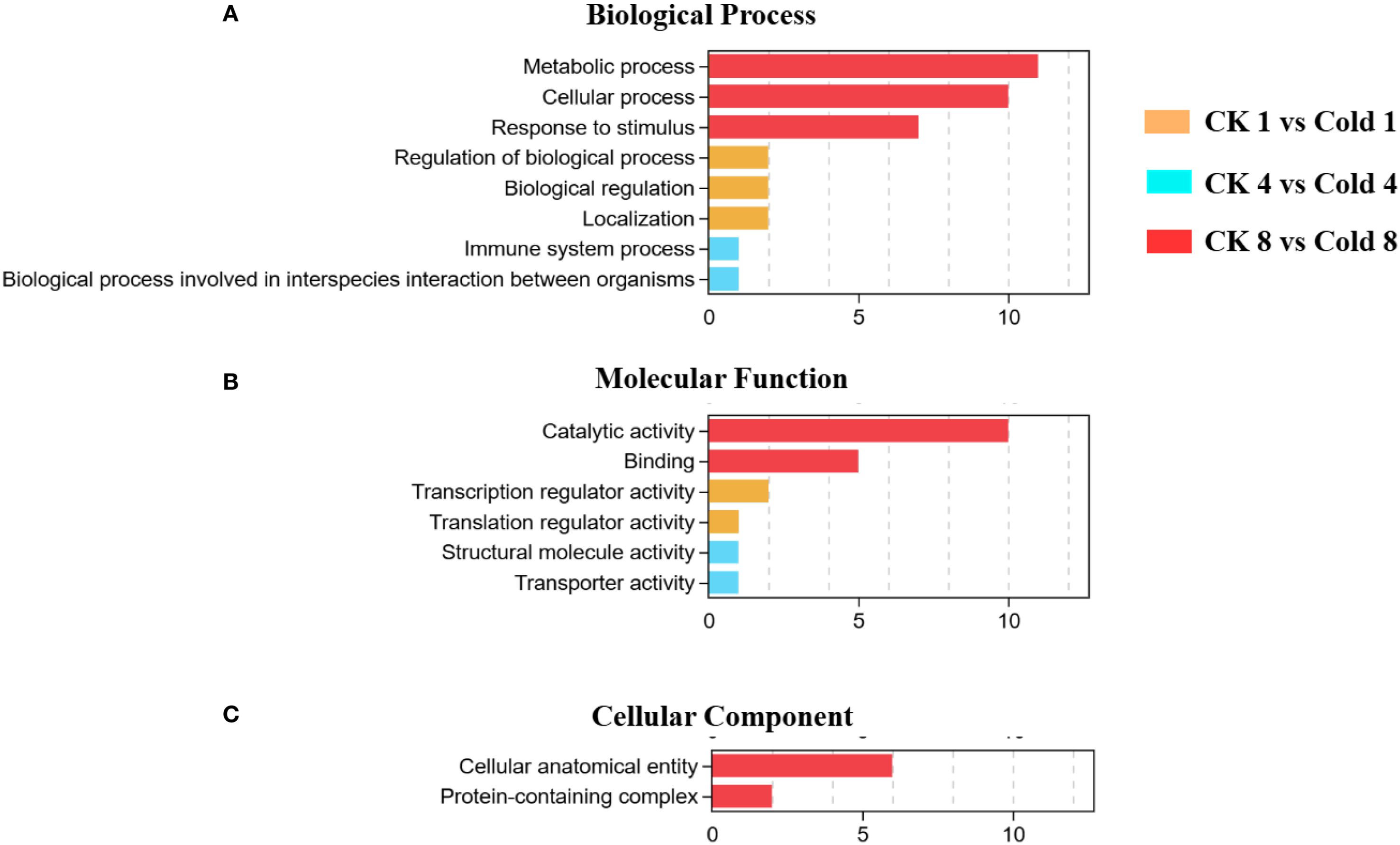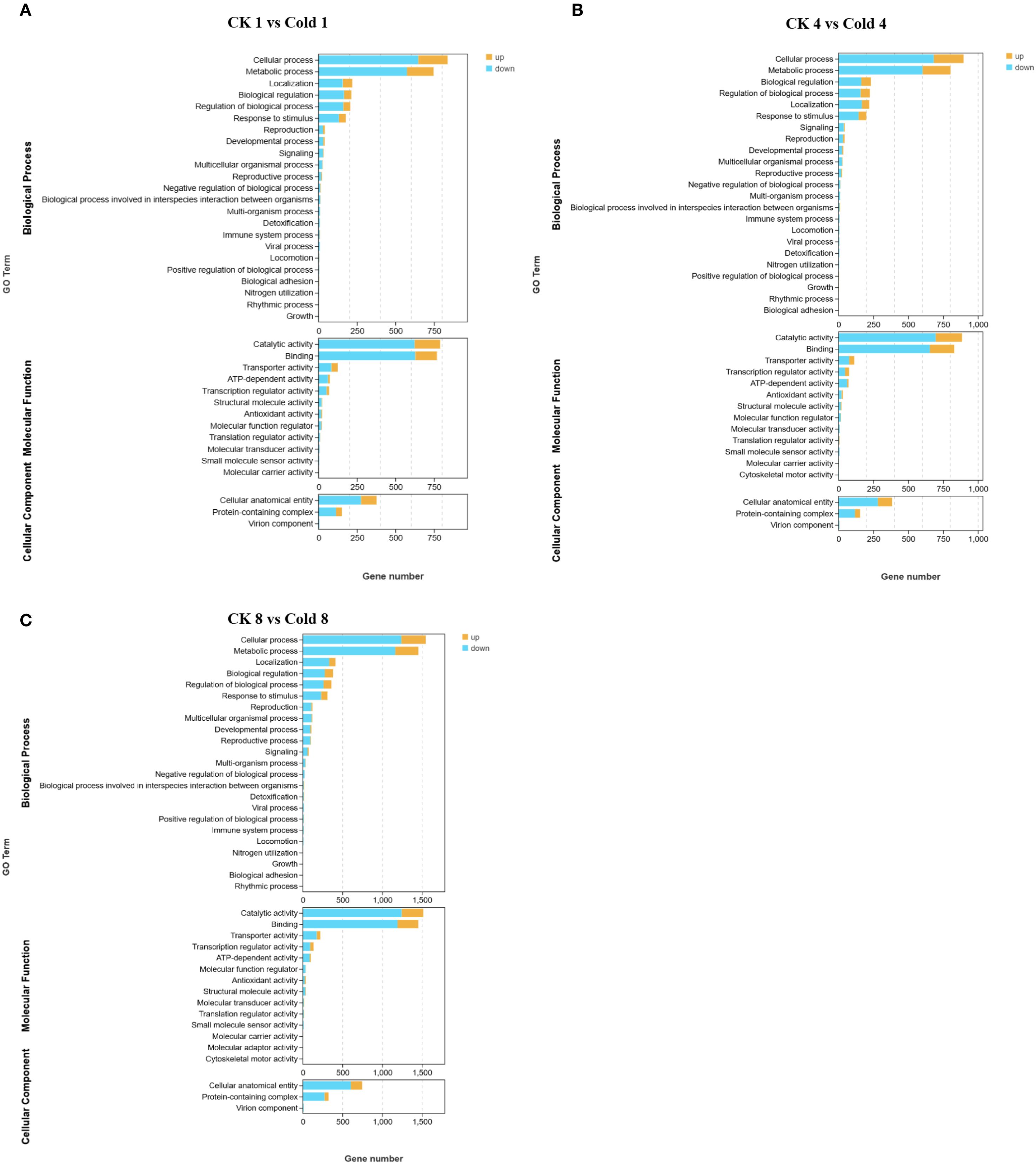 Figure 3. GO analysis analysis of DEGs. (A) ck 1 vs Cold 1, (B) ck 4 vs Cold 4, (C) ck 8 vs Cold 8.