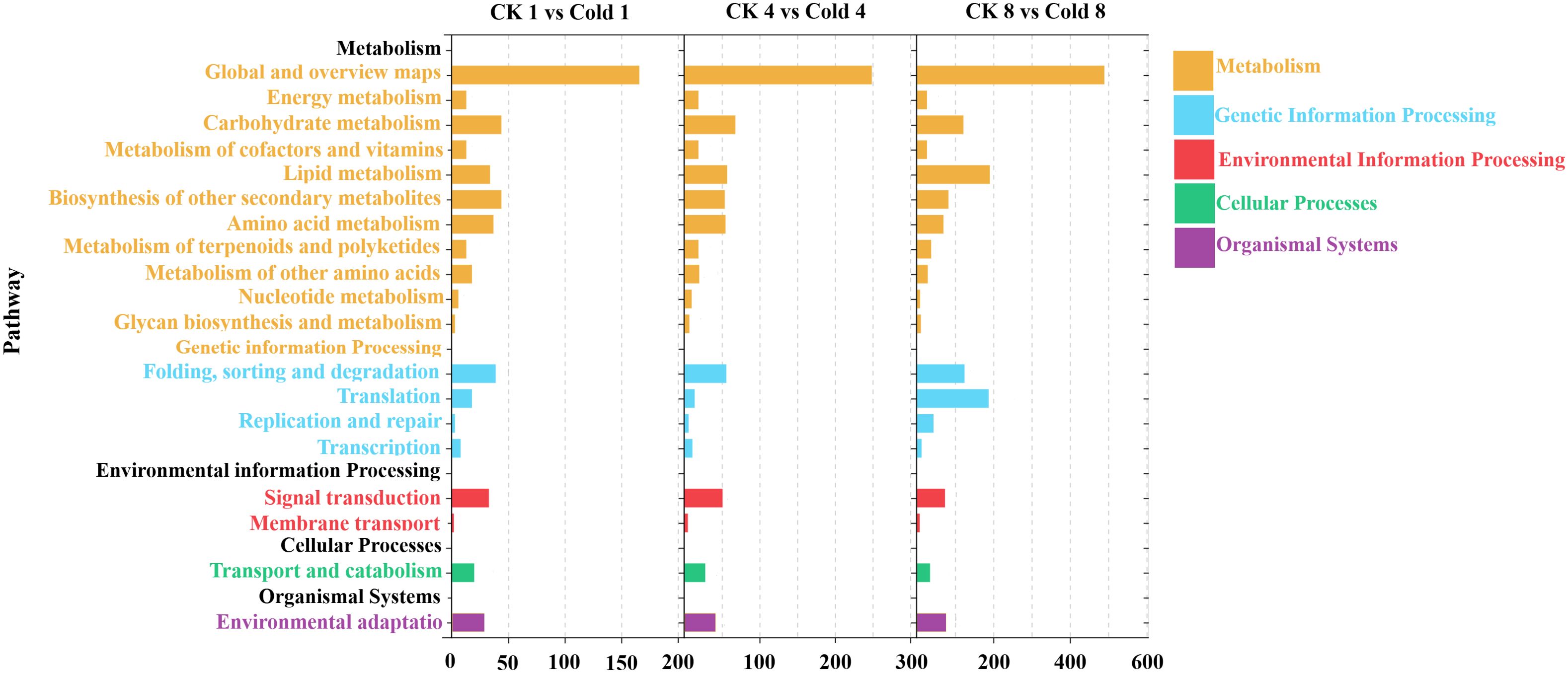 Bar chart comparing levels of various biological pathways across three conditions: CK 1 vs Cold 1, CK 4 vs Cold 4, and CK 8 vs Cold 8. Pathways include metabolism, genetic information processing, environmental information processing, cellular processes, and organismal systems, each represented by distinct colors. Metabolism shows higher values, especially in CK 8 vs Cold 8, while other pathways like genetic information processing also show notable variations.