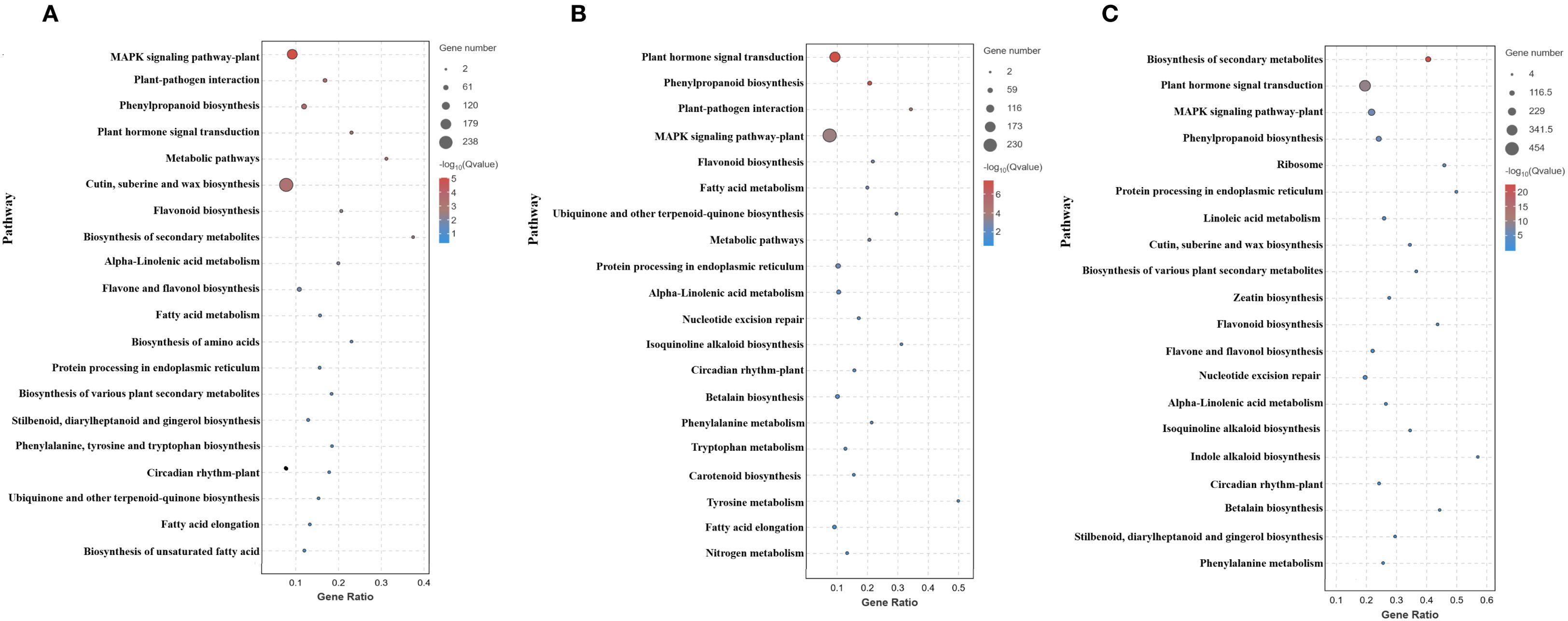 Three bubble charts depict gene pathways with associated gene ratios and numbers. Chart A highlights pathways like MAPK signaling and flavonoid biosynthesis. Chart B shows pathways including plant hormone signaling and metabolic pathways. Chart C features secondary metabolite biosynthesis and ribosome pathways. Bubble size indicates gene number, with color indicating -log Q value.