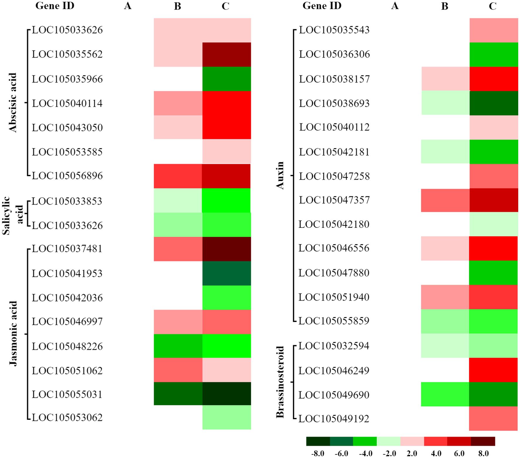 Heat map displaying gene expression levels for various genes associated with abscisic acid, salicylic acid, jasmonic acid, auxin, and brassinosteroid. Each gene ID is aligned with three conditions, A, B, and C, represented by color gradients from green (low) to red (high).