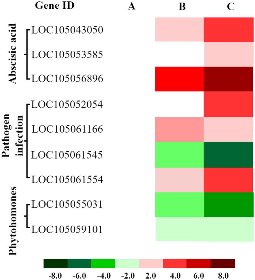 Heatmap displaying expression levels of various genes related to abscisic acid, pathogen infection, and phytohormones. Gene IDs are listed vertically with corresponding segments labeled A, B, C. Shades of red and green indicate expression intensity, with a color scale ranging from -8.0 (dark green) to 8.0 (dark red).
