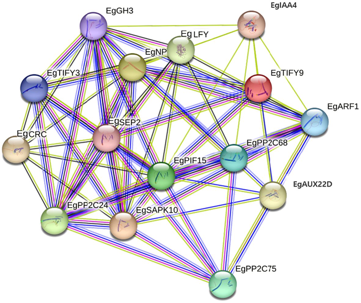 PPI analysis identified 15 core interacting proteins (EgIAA4, EgGH3, EgARF1, EgTIFY9, EgLFY, EgNP, EgTIFY3, EgCRC, EgSEP2, EgPP2C24/68/75, EgARF1, EgAUX22D, and EgSAPK10) constituting a potential cold-responsive regulatory module (Figure 9). The prevalence of PP2C family members highlights their roles in ABA signaling as negative regulators. The presence of auxin-associated proteins (EgIAA4, EgGH3, EgARF1) implies crosstalk between auxin and stress-responsive pathways (e.g., EgSAPK10). Collectively, these proteins may form an integrated network that coordinates hormonal and stress responses, with EgARF1 and PP2Cs as potential key nodes.