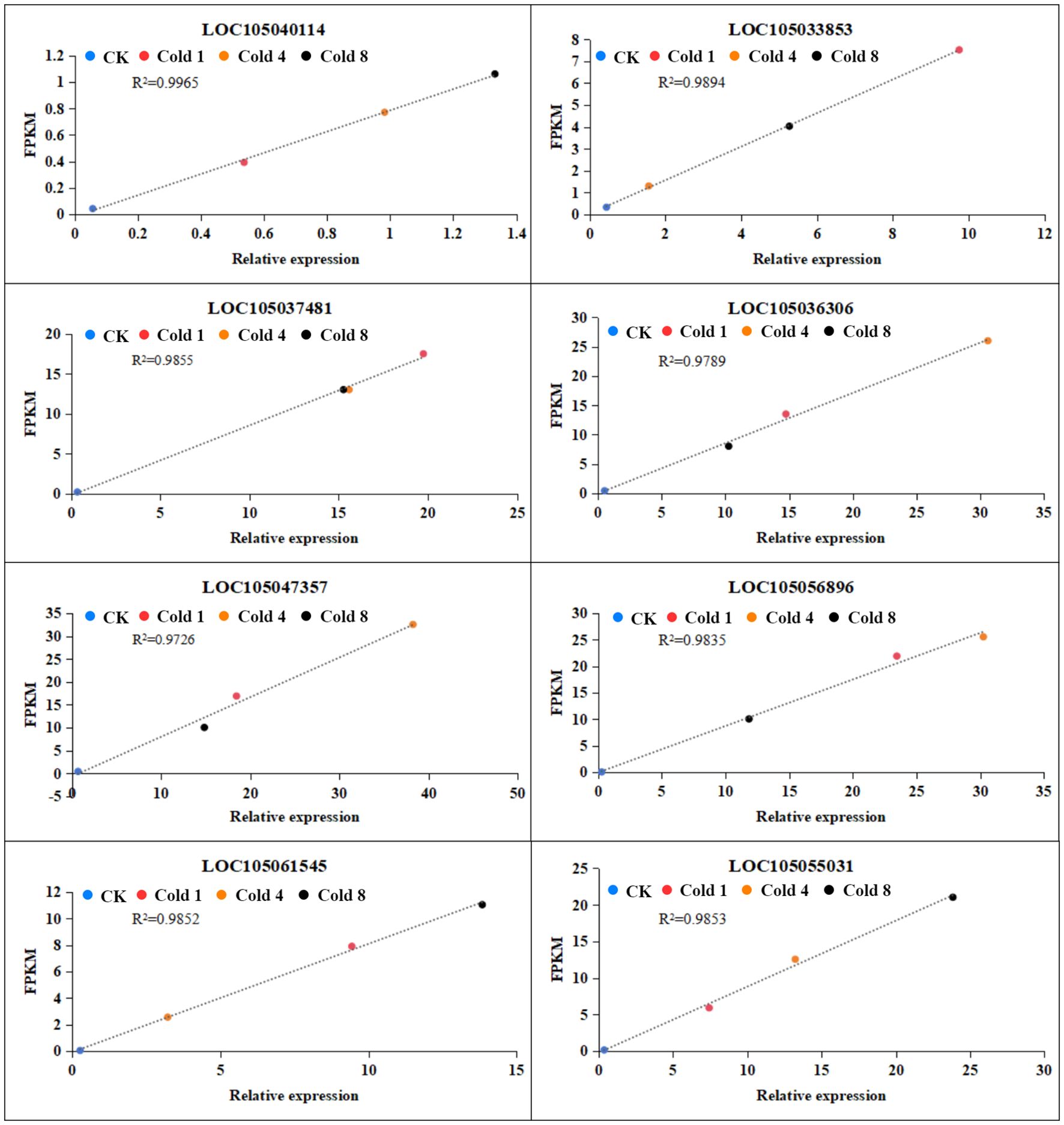 Nine scatter plots display the relationship between FPKM and relative expression for different genes under various cold conditions (CK, Cold 1, Cold 4, Cold 8). Each plot indicates a high correlation (R² values ranging from 0.9726 to 0.9965) with a dotted line representing the trend. Each plot is labeled with a unique gene identifier: LOC105040114, LOC105033853, LOC105037481, LOC105036306, LOC105047357, LOC105056896, LOC105061545, and LOC105050531. The colors represent different conditions: blue for CK, red for Cold 1, orange for Cold 4, and black for Cold 8.