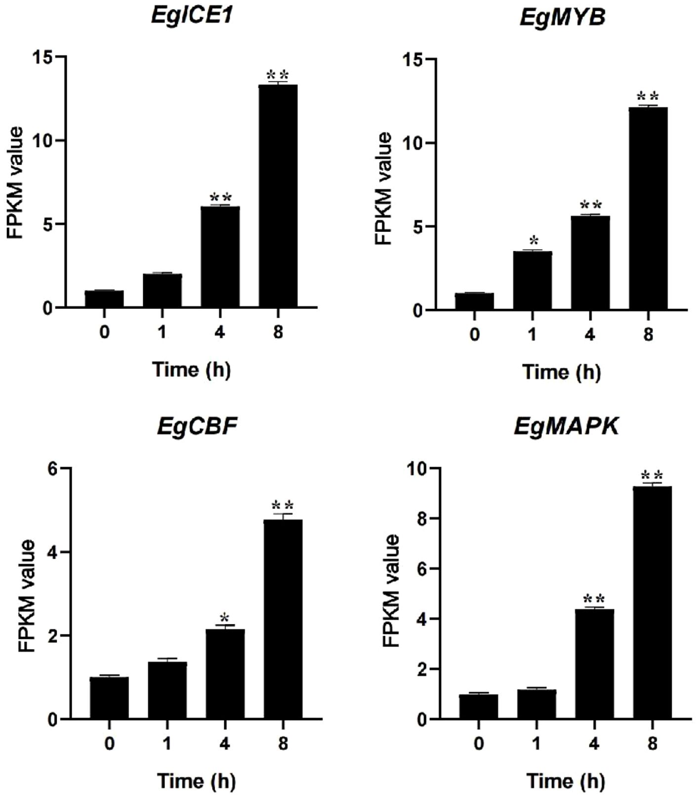 Bar charts showing FPKM values over time for four genes: EgICE1, EgMYB, EgCBF, and EgMAPK. Each chart has time points at 0, 1, 4, and 8 hours. All genes show increasing expression levels, with highest values at 8 hours. Statistical significance is indicated by asterisks.