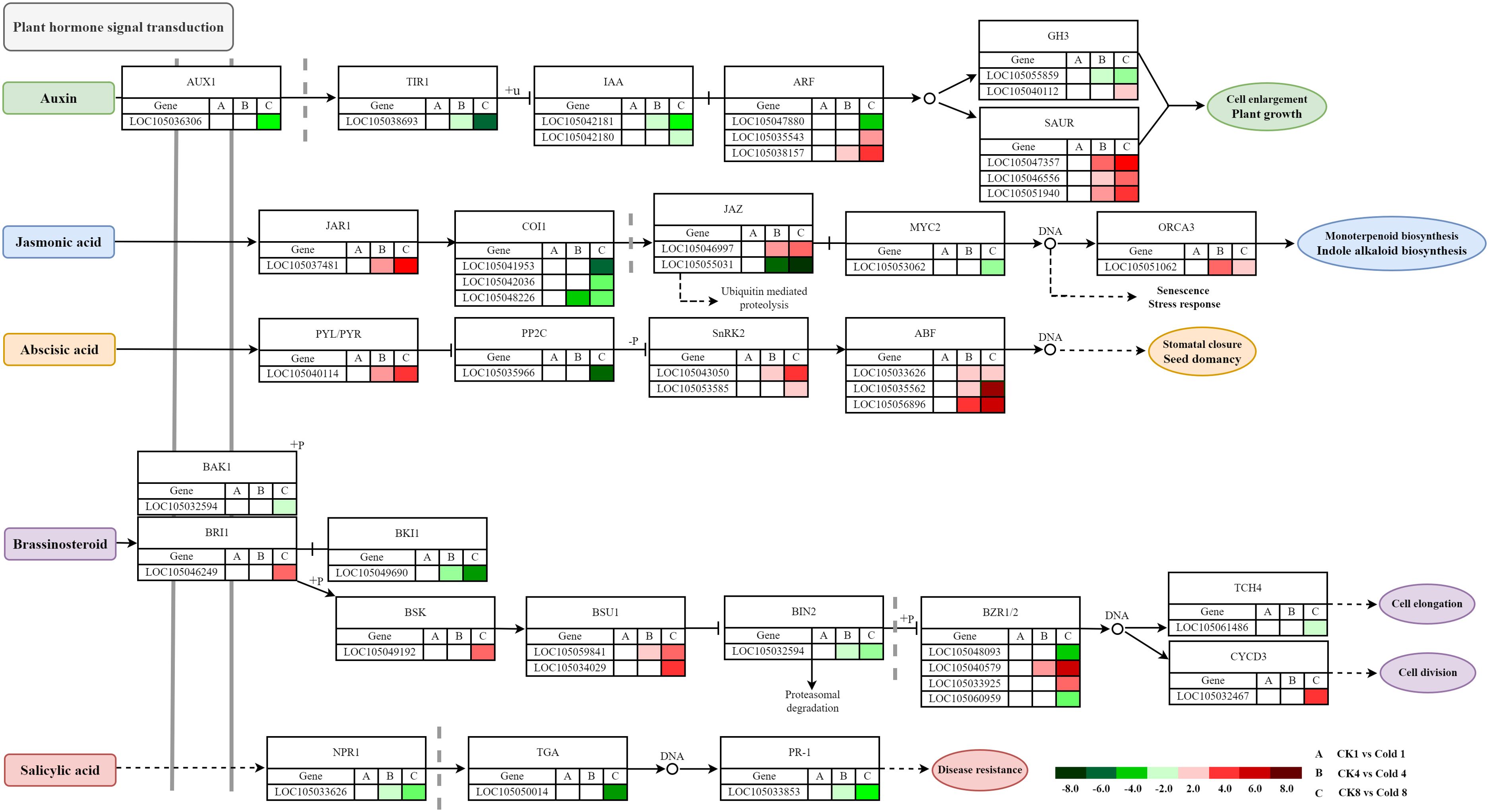 Core components (TIR1/AFB–Aux/IAA–ARF) integrate auxin with ABA and ROS under cold (Rahman, 2013; Yu et al., 2017; Sharma et al., 2021; Du et al., 2022). We identified AUX1 (LOC1050536306), TIR1 (LOC105038693), IAA (LOC105042181, LOC105042180), ARF (LOC105047880, LOC105035543, LOC105038157), GH3 (LOC105055859, LOC105040112), and SAUR (LOC105047357, LOC105046556, LOC105051940) (Figure 12). Downregulation of AUX1/TIR1 suggests reduced transport/perception; SAUR genes were upregulated, whereas AUX1, TIR1, IAA, ARF, and GH3 were downregulated, indicating auxin pathway suppression to conserve energy.