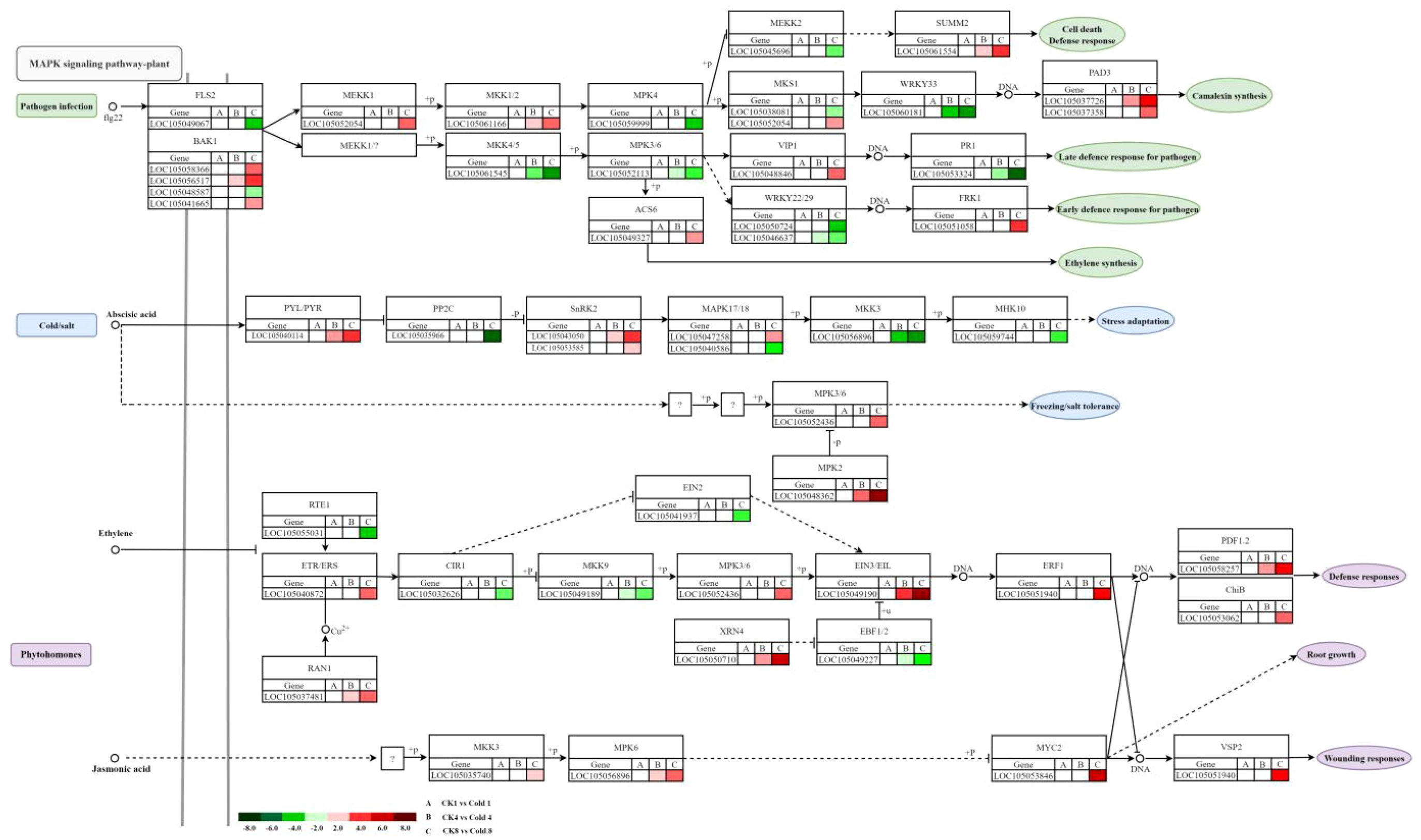 Figure 8. Expression patterns of cold-responsive DEGs in hormone signaling and stomatal development pathways mediated by MAPK cascade. Heatmaps display expression patterns of differentially expressed genes (DEGs) associated with ABA signaling, pathogen defense, and phytohormone signaling pathways at three time points: (A) 1 hour (CK 1 h vs. Cold 1 h), (B) 4 hours (CK 4 h vs. Cold 4 h), and (C) 8 hours (CK 8 h vs. Cold 8 h) of cold exposure. Red: Upregulated genes (log2FC > 1, FDR < 0.05). Green: Downregulated genes (log2FC < −1, FDR < 0.05).